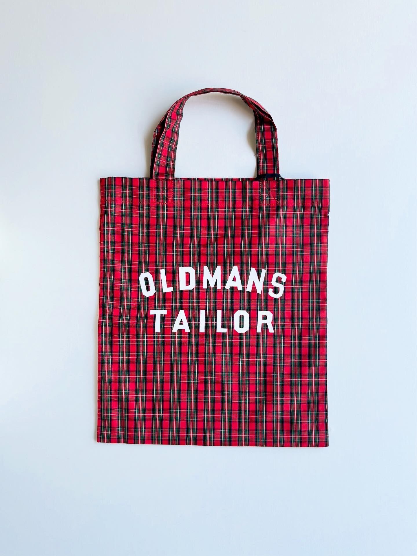 薄手の目の詰まったブロードのようなタータンチェック生地に"OLDMANSTAILOR"よラバープリントを施したバッグ。