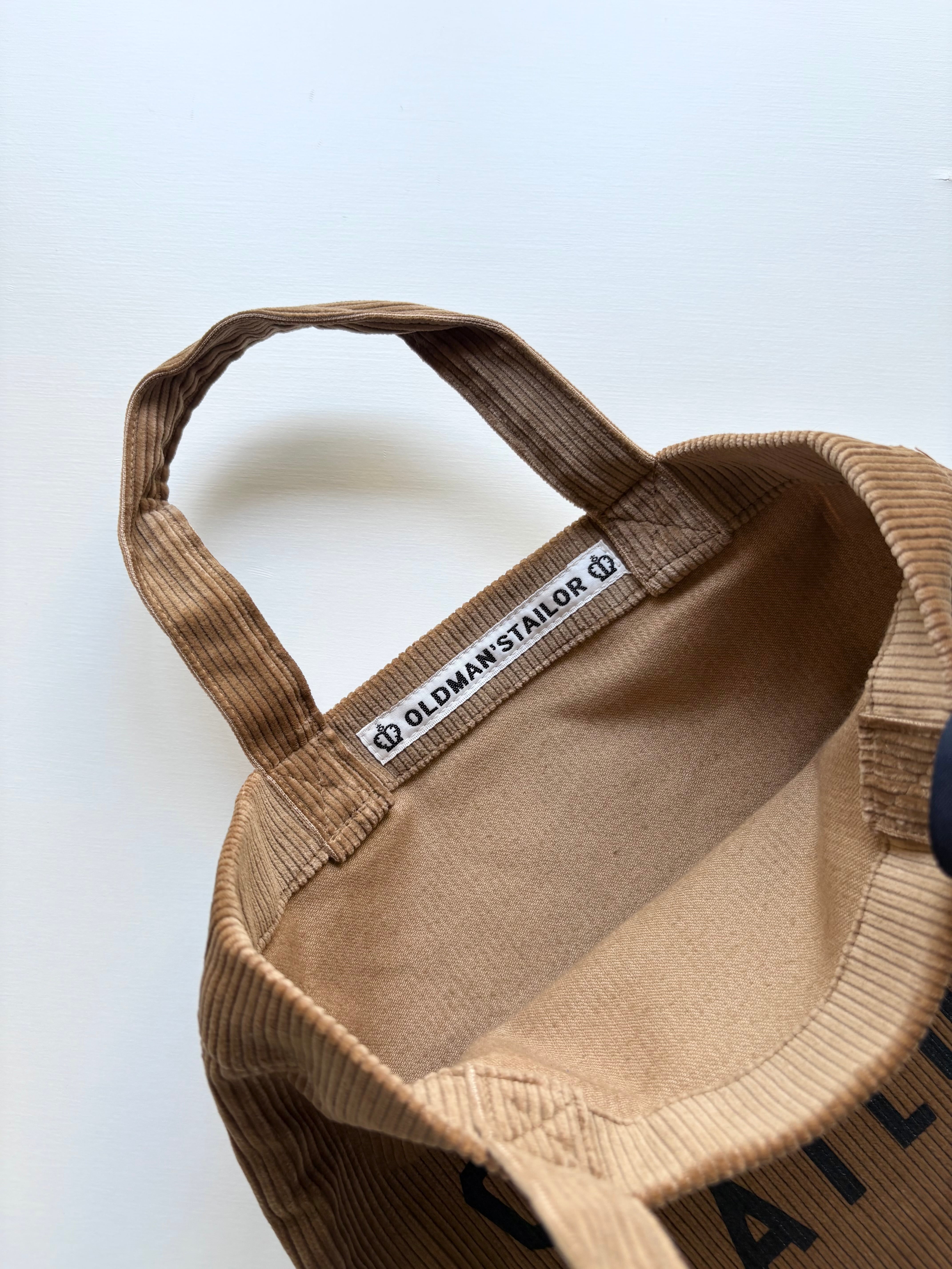 太めの畝で程よく厚みのある生地に"OLDMANSTAILOR"のラバープリントを施したバッグ。