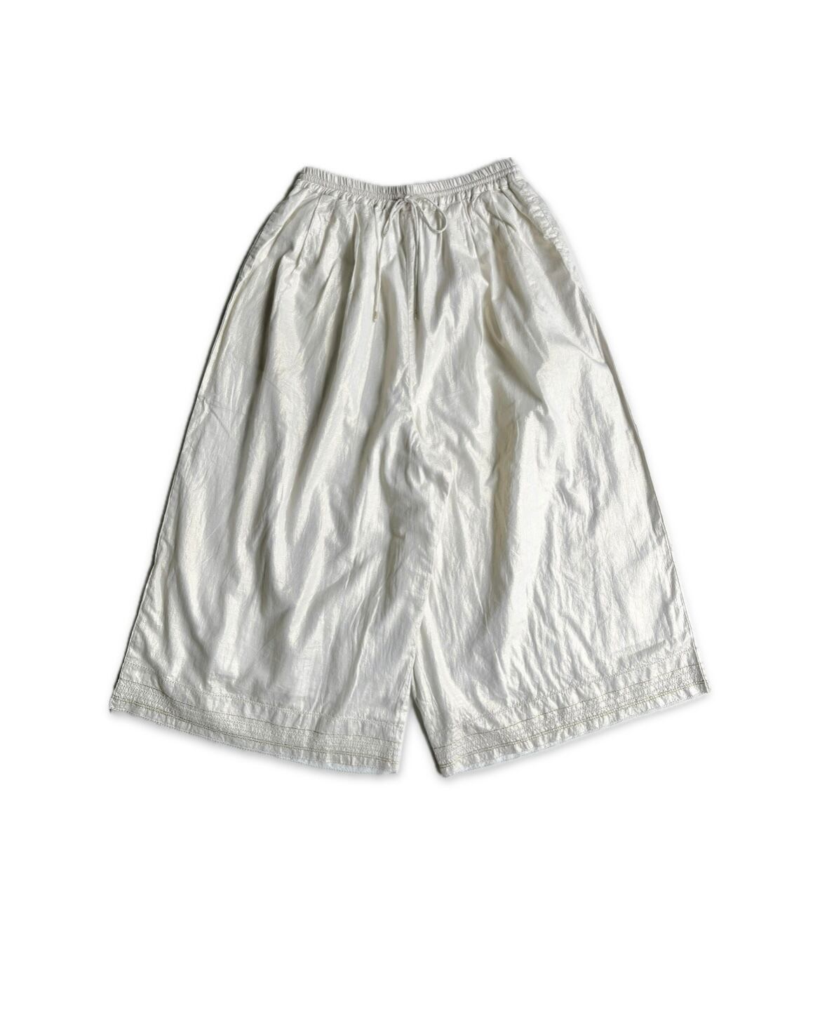薄手の綿生地にゴールドの箔プリントを施し、煌びやかに輝くパンツに仕立てられています。