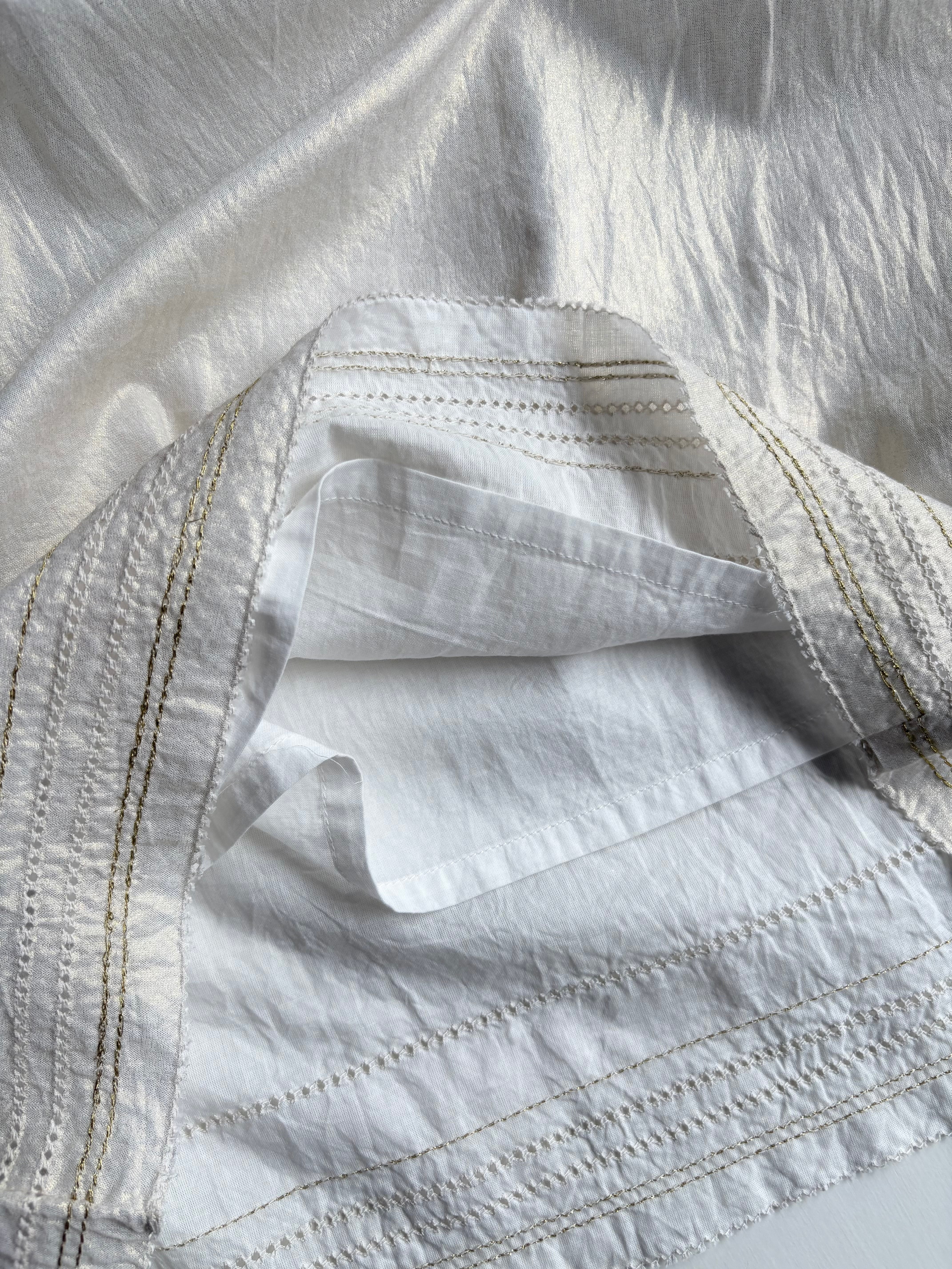 着用時にはスカートのようなシルエットのパンツで、裾にはゴールド糸のステッチと、ハシゴレースのようなカットワーク刺繍が施されています。