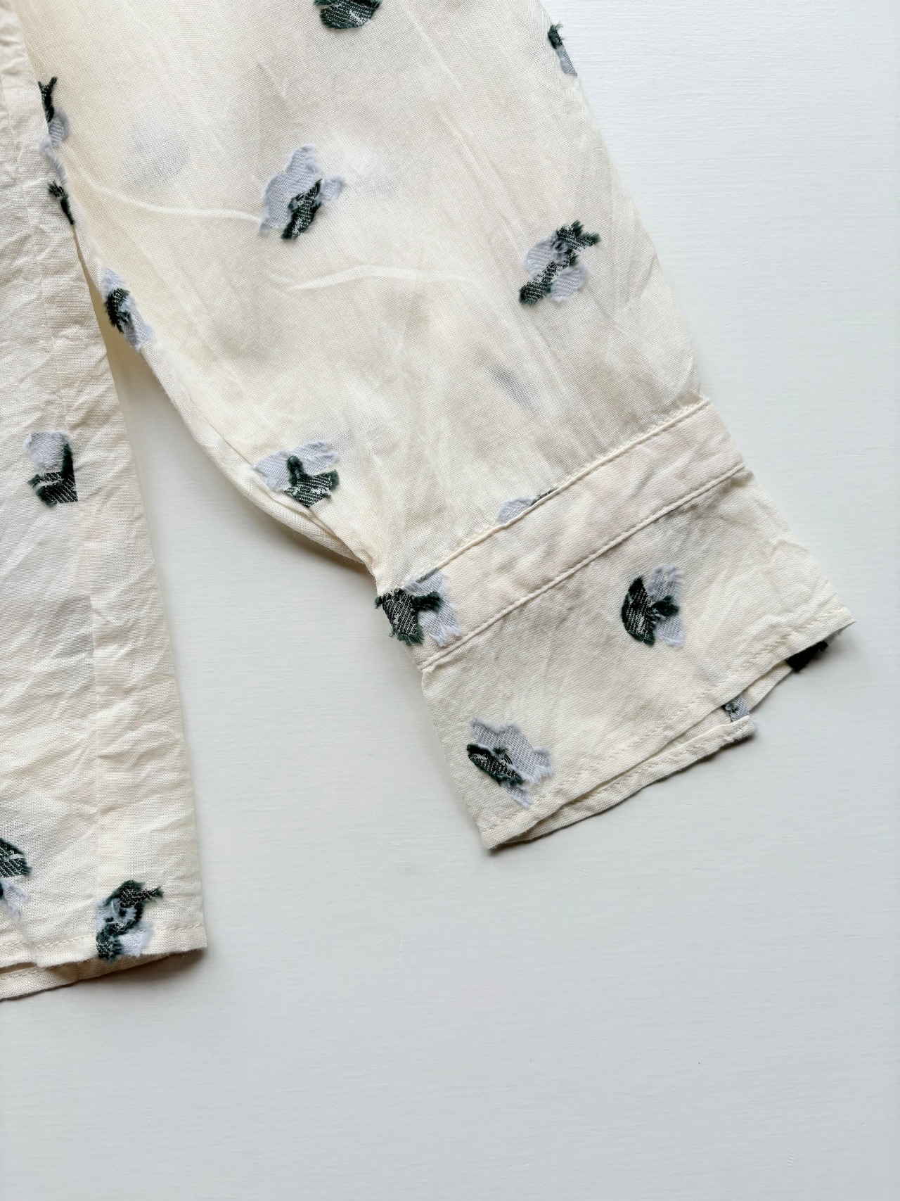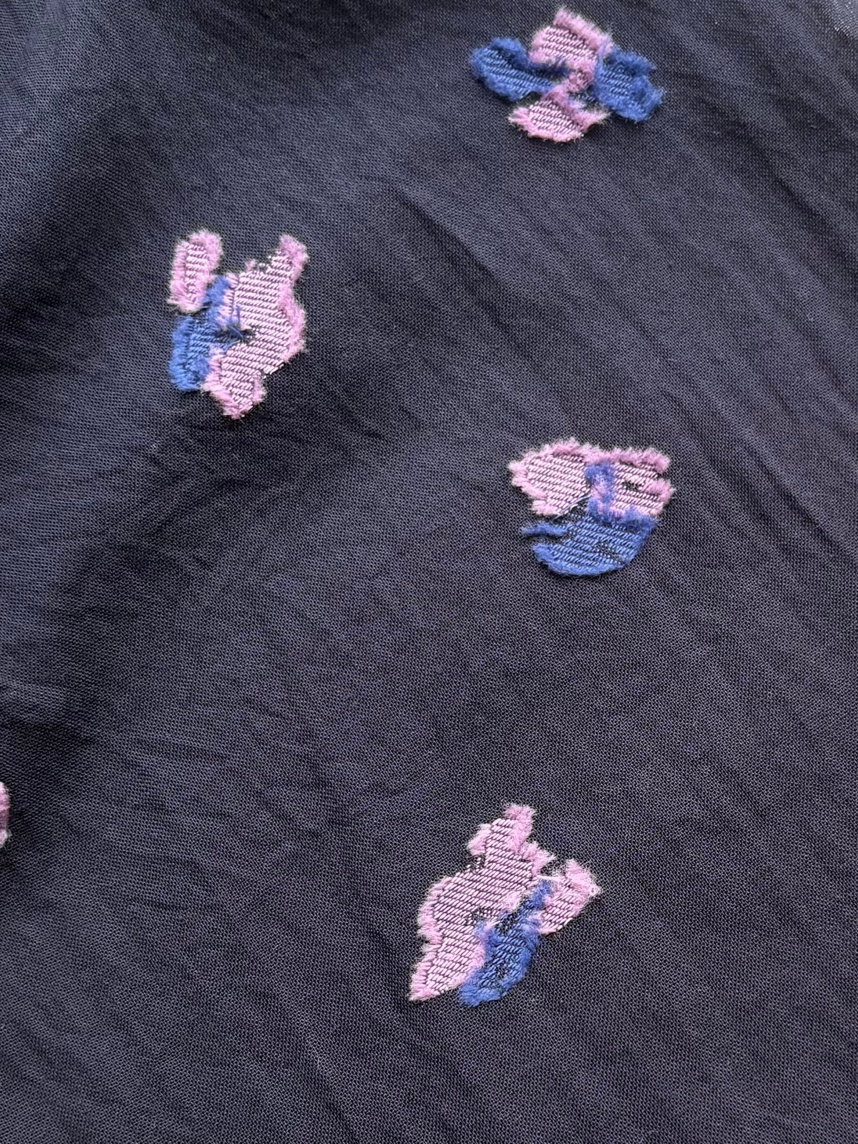 レイヤードしやすい生地感で、タートルネックと合わせたり、冬場にはニットを重ねて袖や裾からチラリと見せるフラワーモチーフが目を引くコーディネートに。