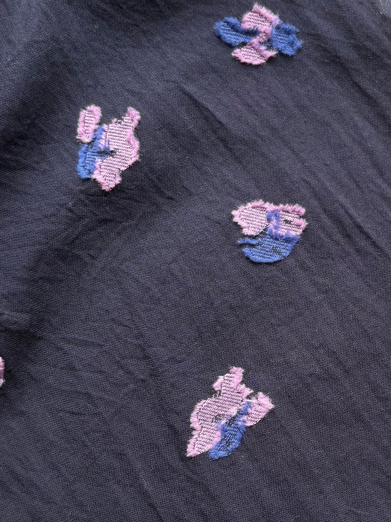 ジャガード織り機で柄を織り込み、模様のない部分に渡った糸をカットした技法です。