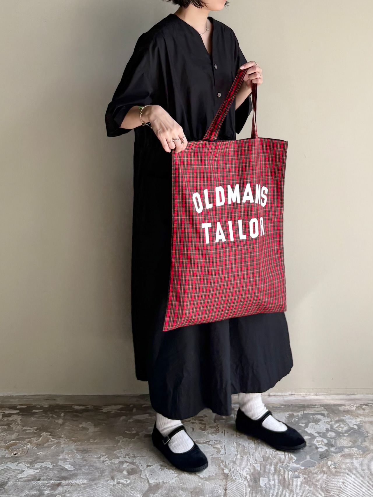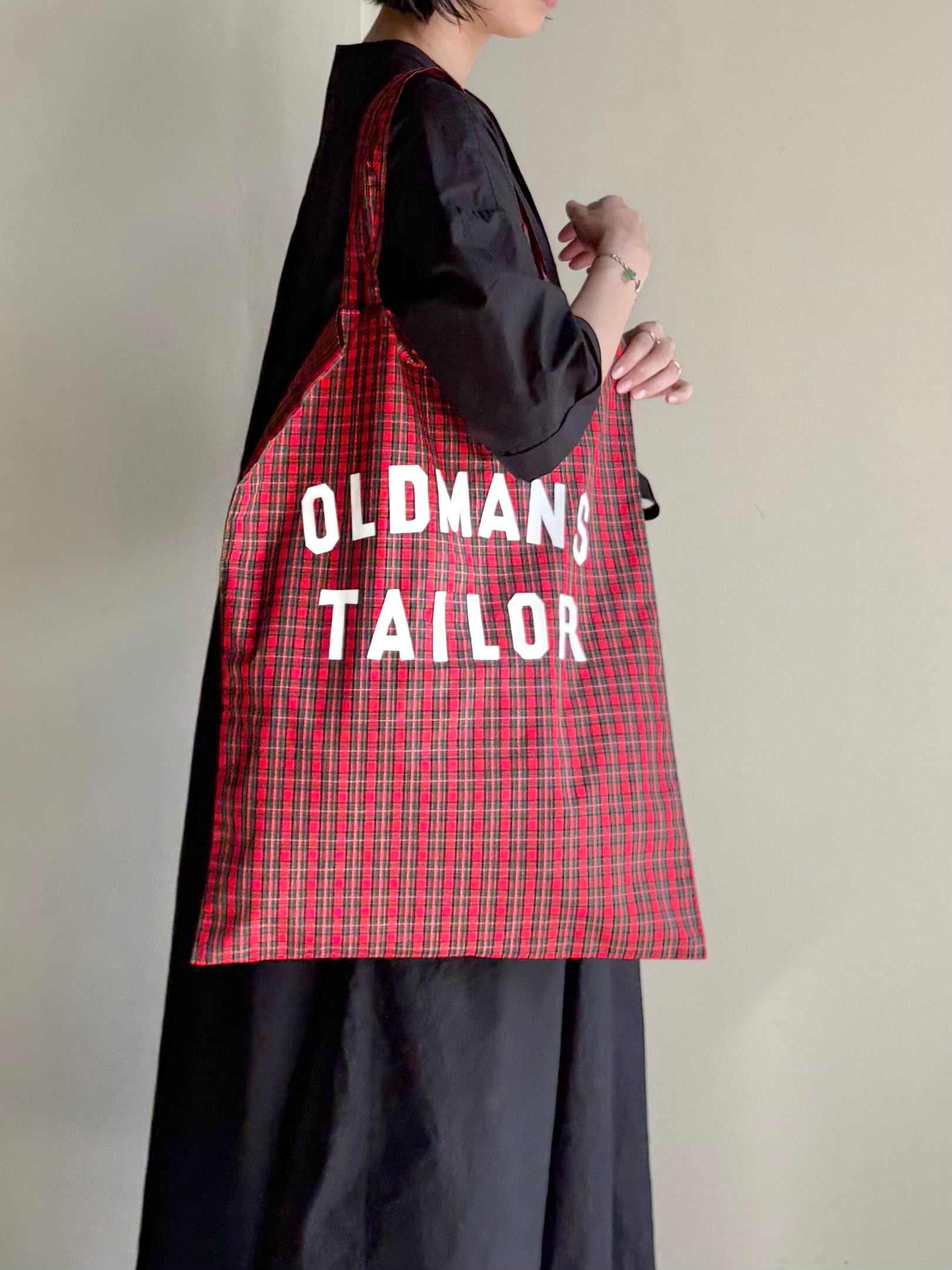 薄手の目の詰まったブロードのようなタータンチェック生地に"OLDMANSTAILOR"よラバープリントを施したバッグ。
