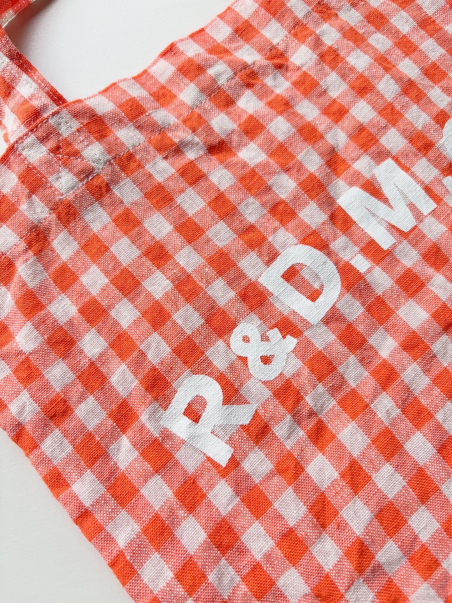 ギンガムチェックのリネン生地に " R&D.M.Co- "のプリントを施したバッグ。