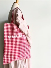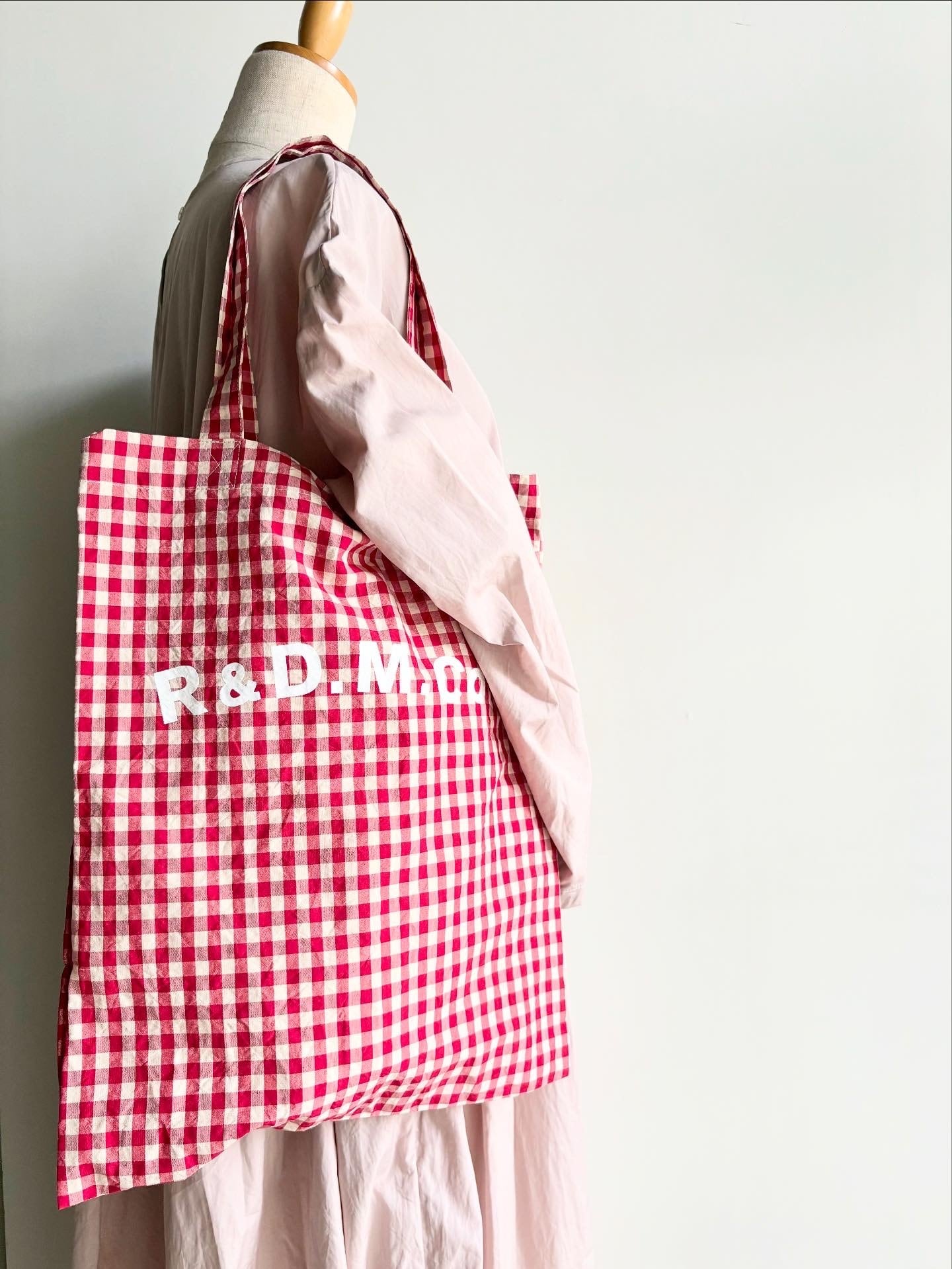 少し張りのあるギンガムチェック生地に" R&D.M.Co- "のプリントを施したバッグ。