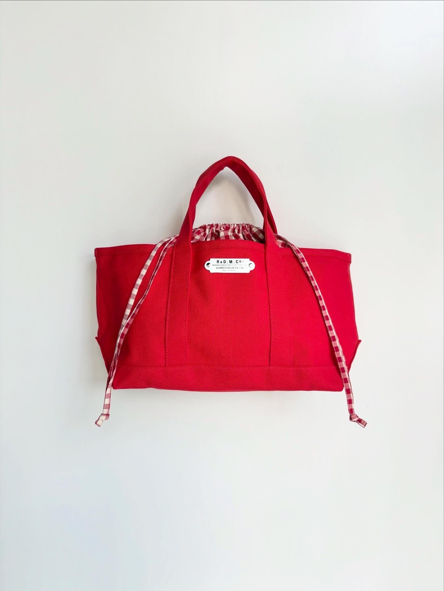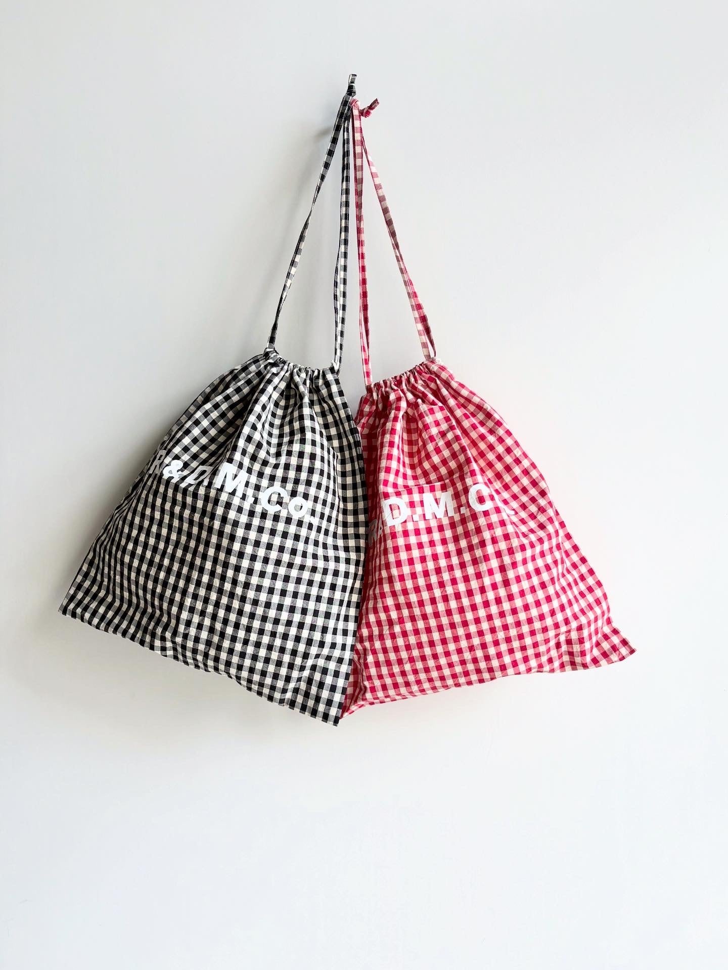少し張りのあるギンガムチェック生地に " R&D.M.Co- "のプリントを施したバッグ。
