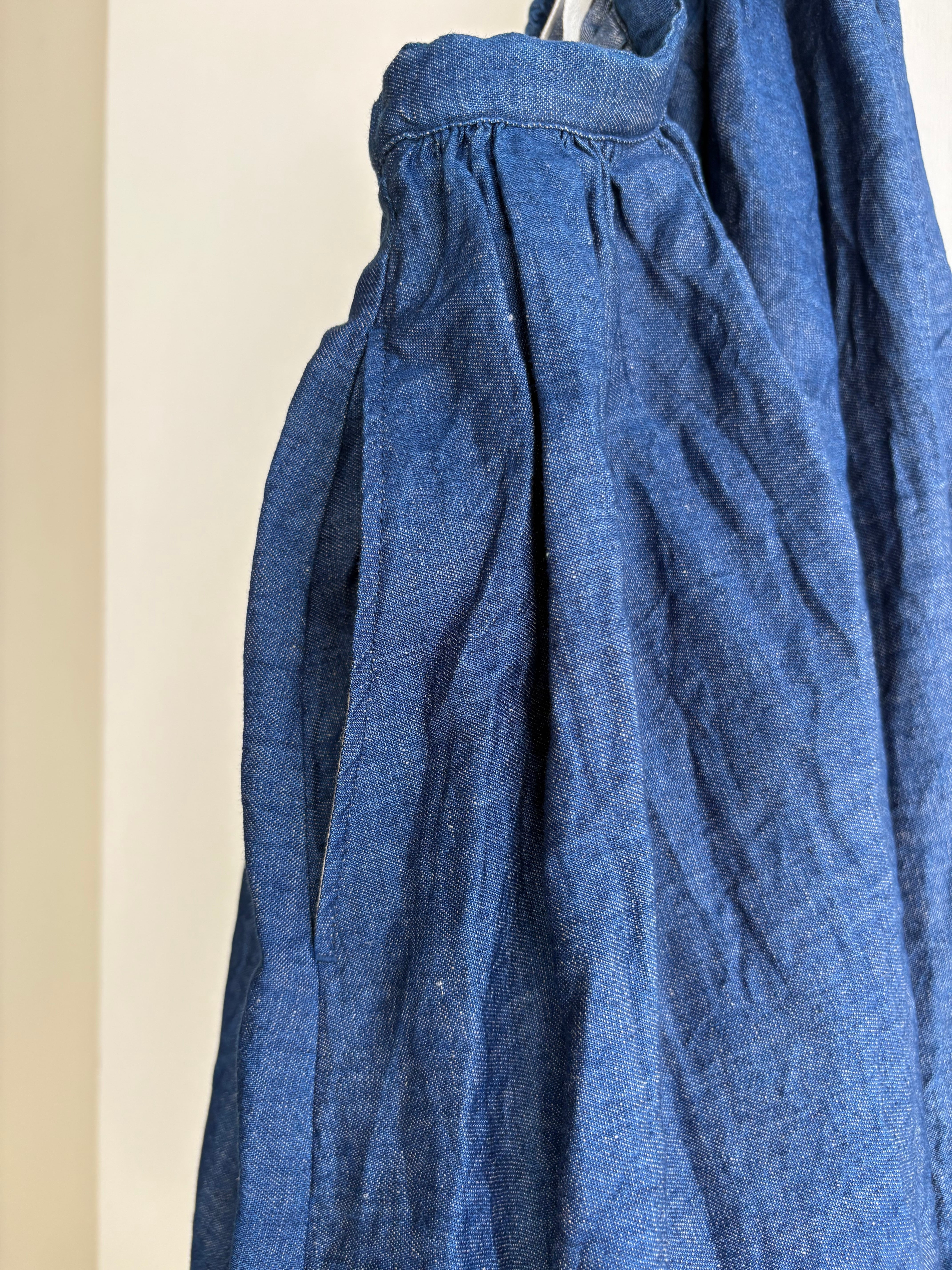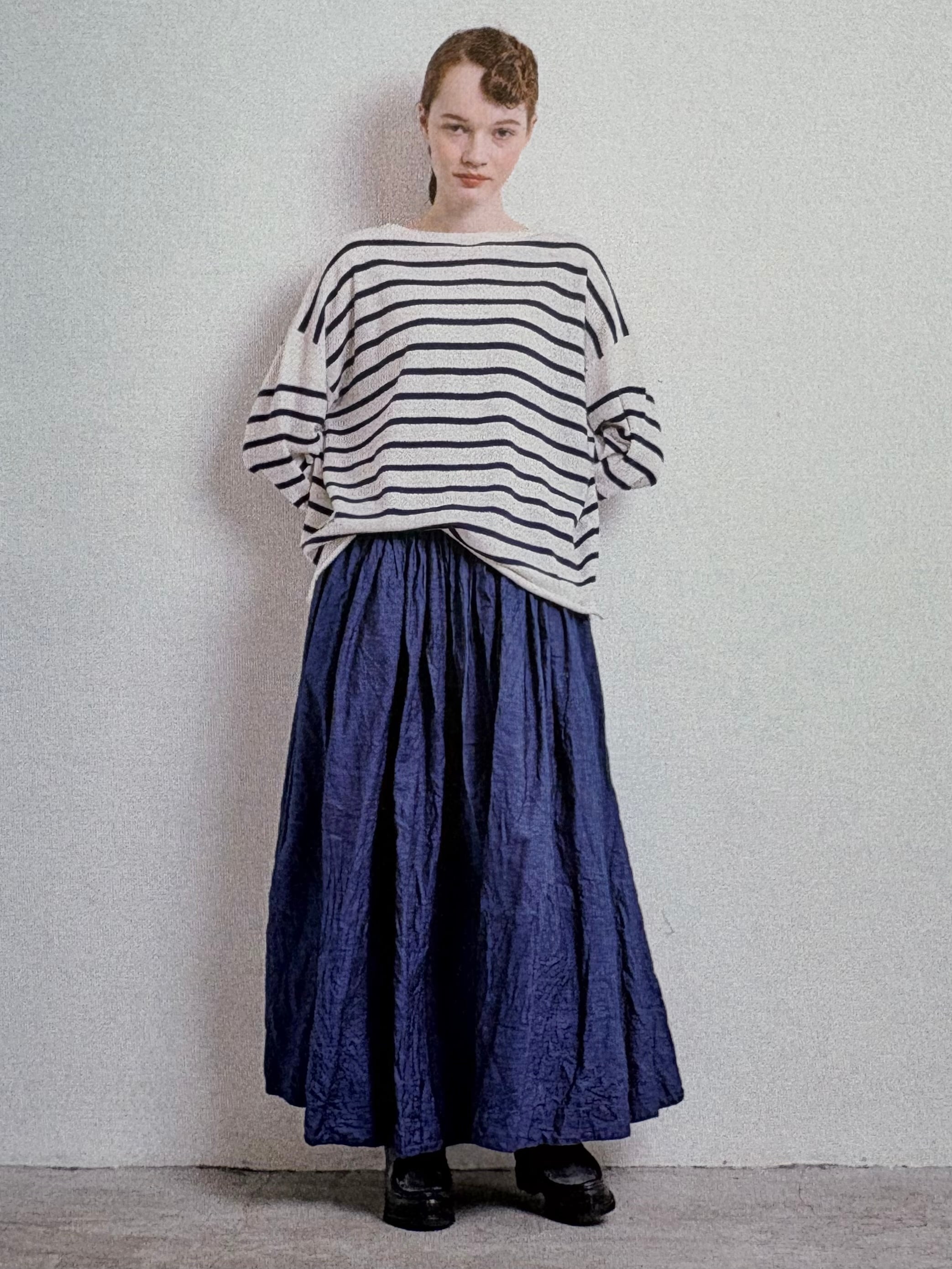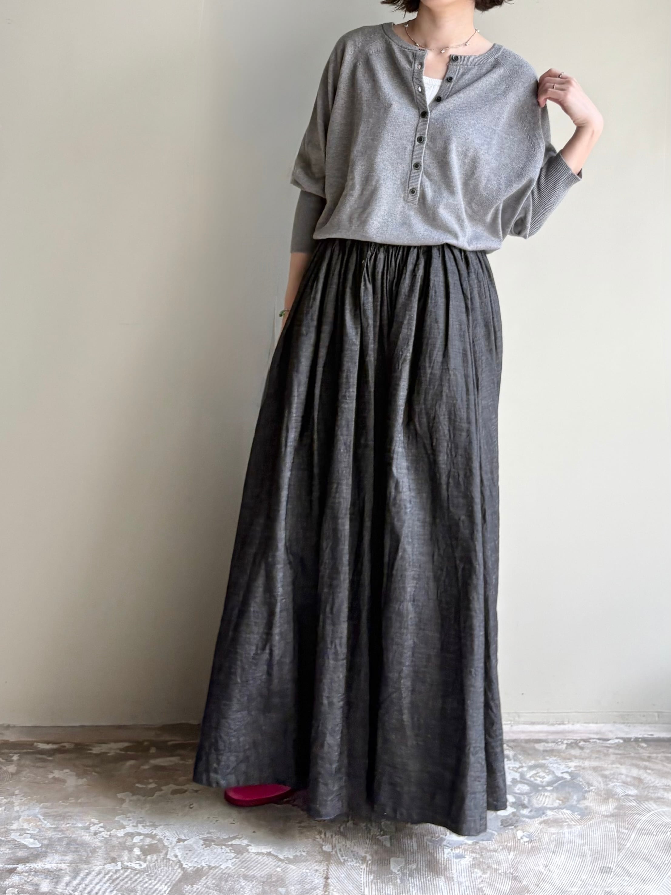 アレンジしたデニムスカートはコーディネートの幅を広げてくれ、ヴィンテージのような経年変化を楽しめるコットンリネンデニムを使用。