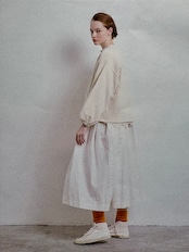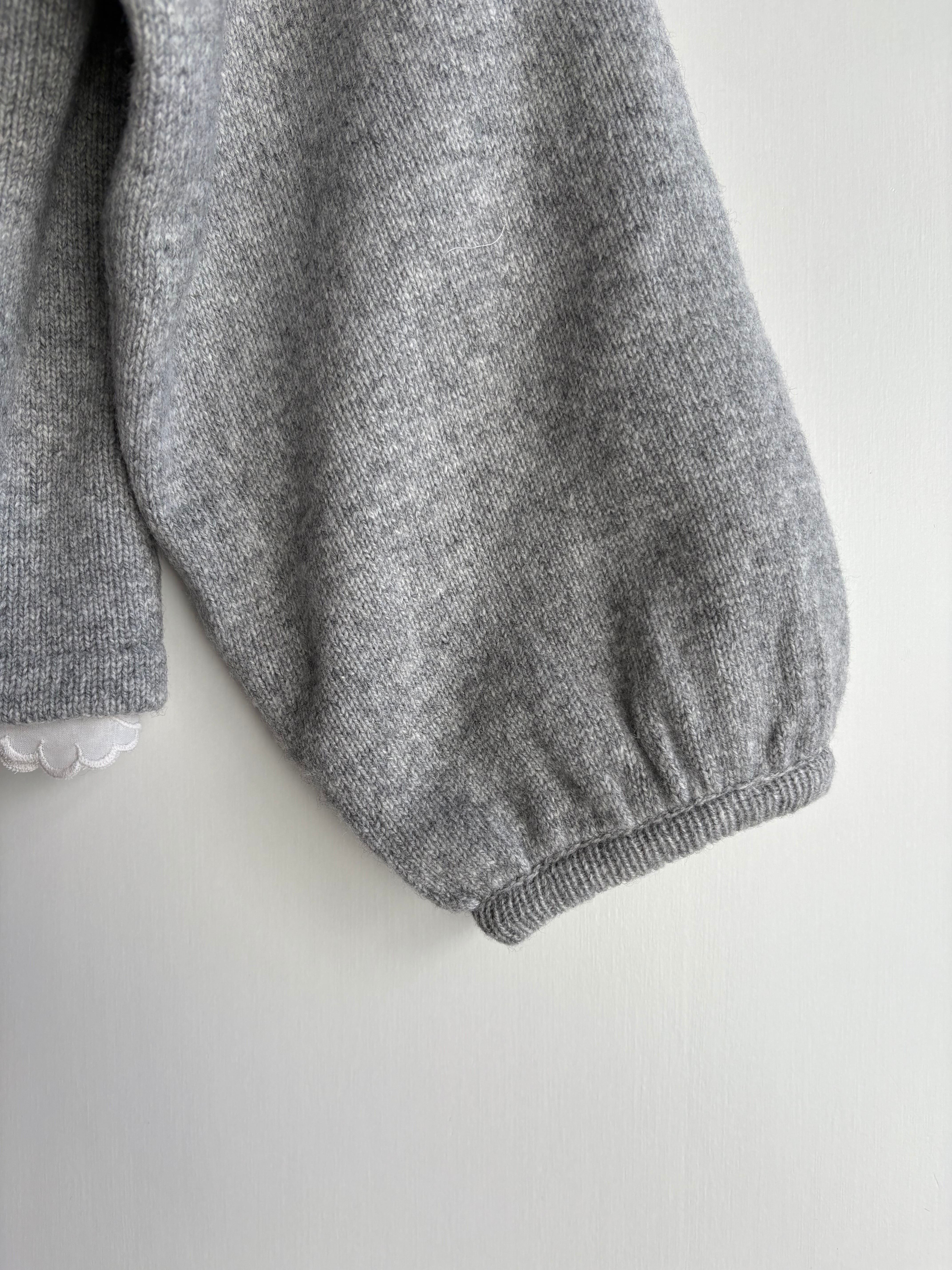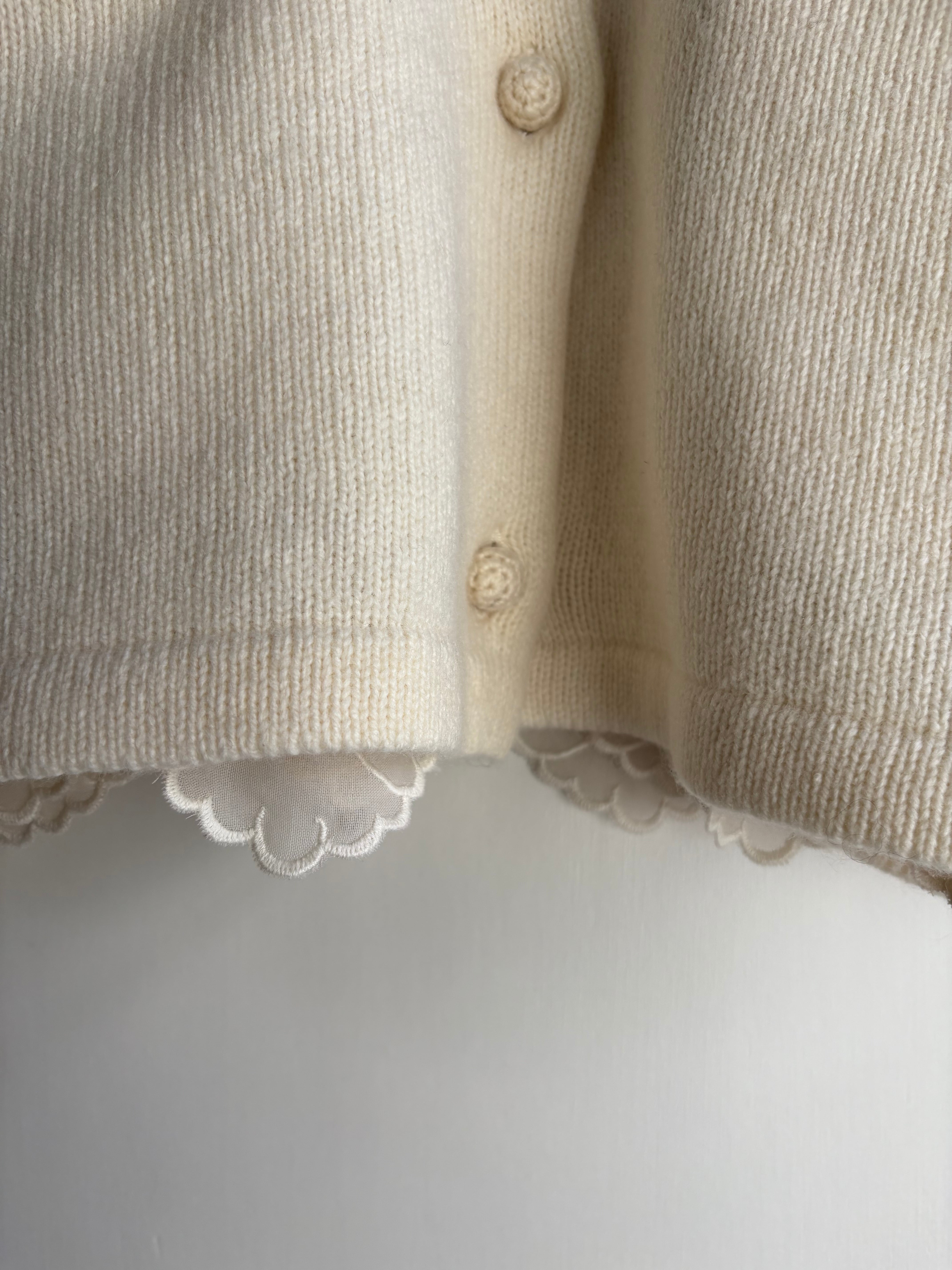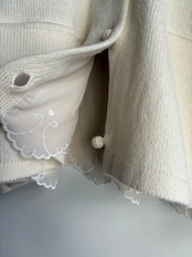 スカラップ刺繍を施したオーガンジーを内布にし、ニットカーディガンの裾からスカラップ刺繍がチラリと見えるデザインに。