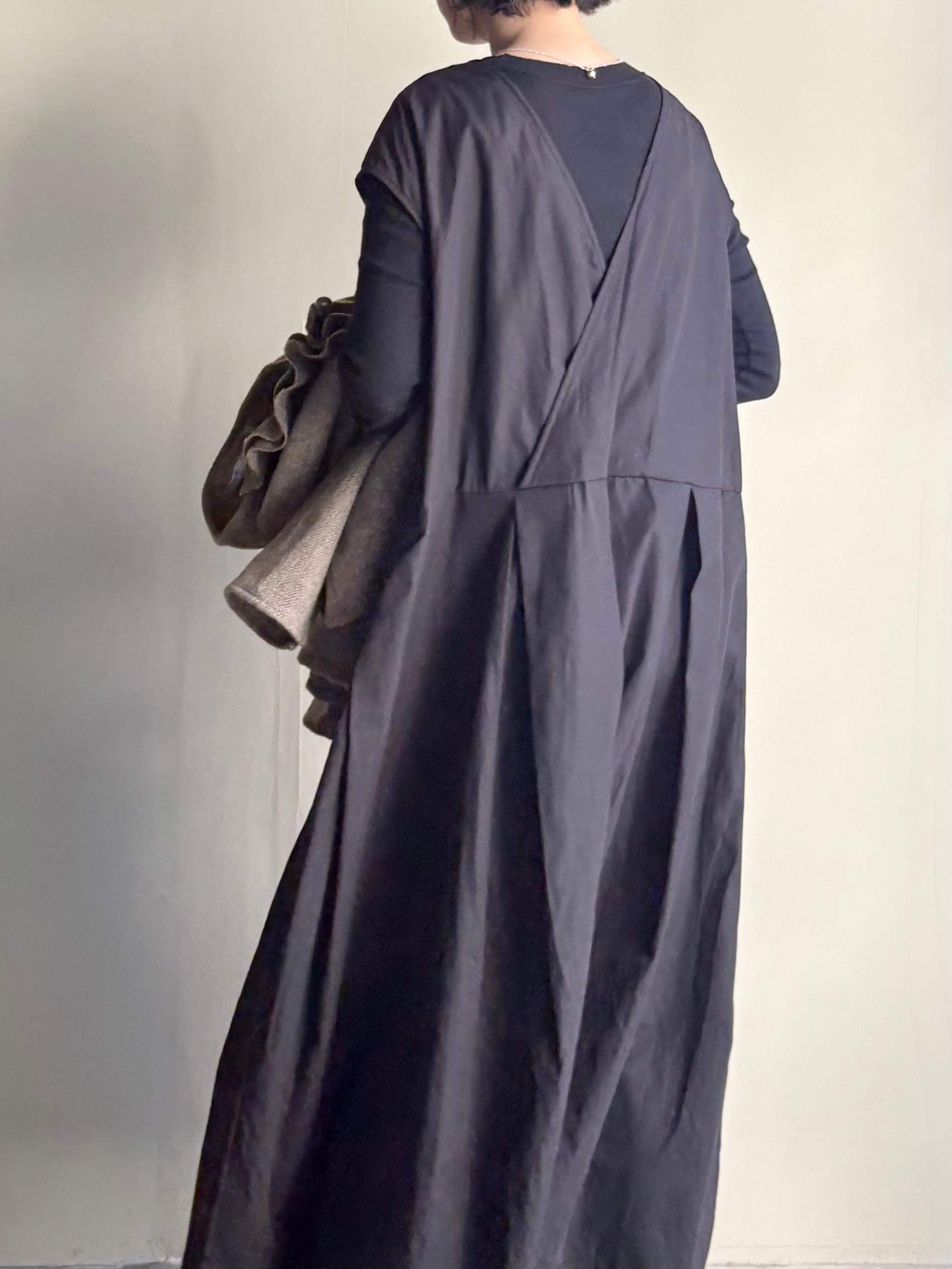フロントはシンプルに、バックはカシュクールデザインでアクセントを入れたノースリーブワンピース。