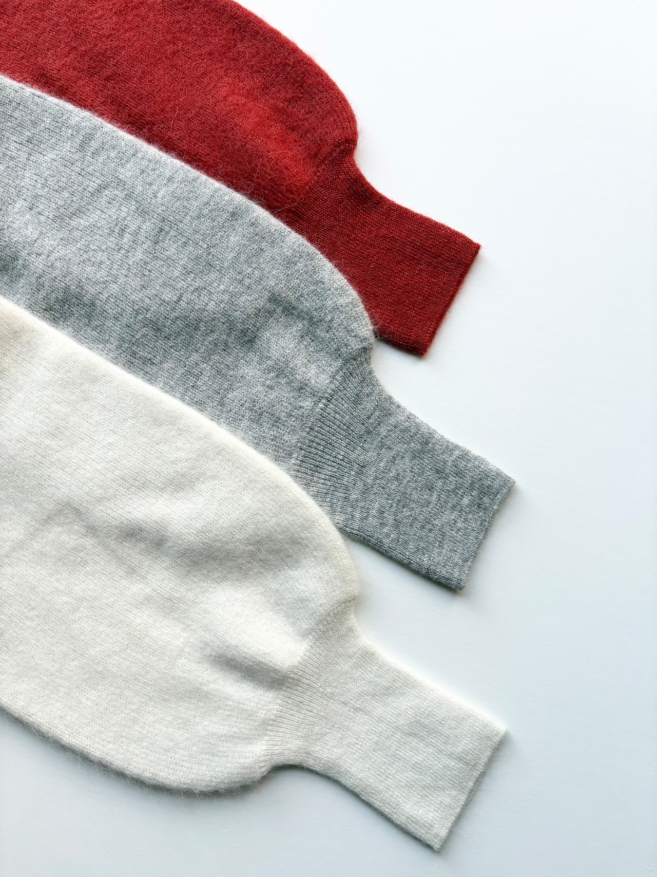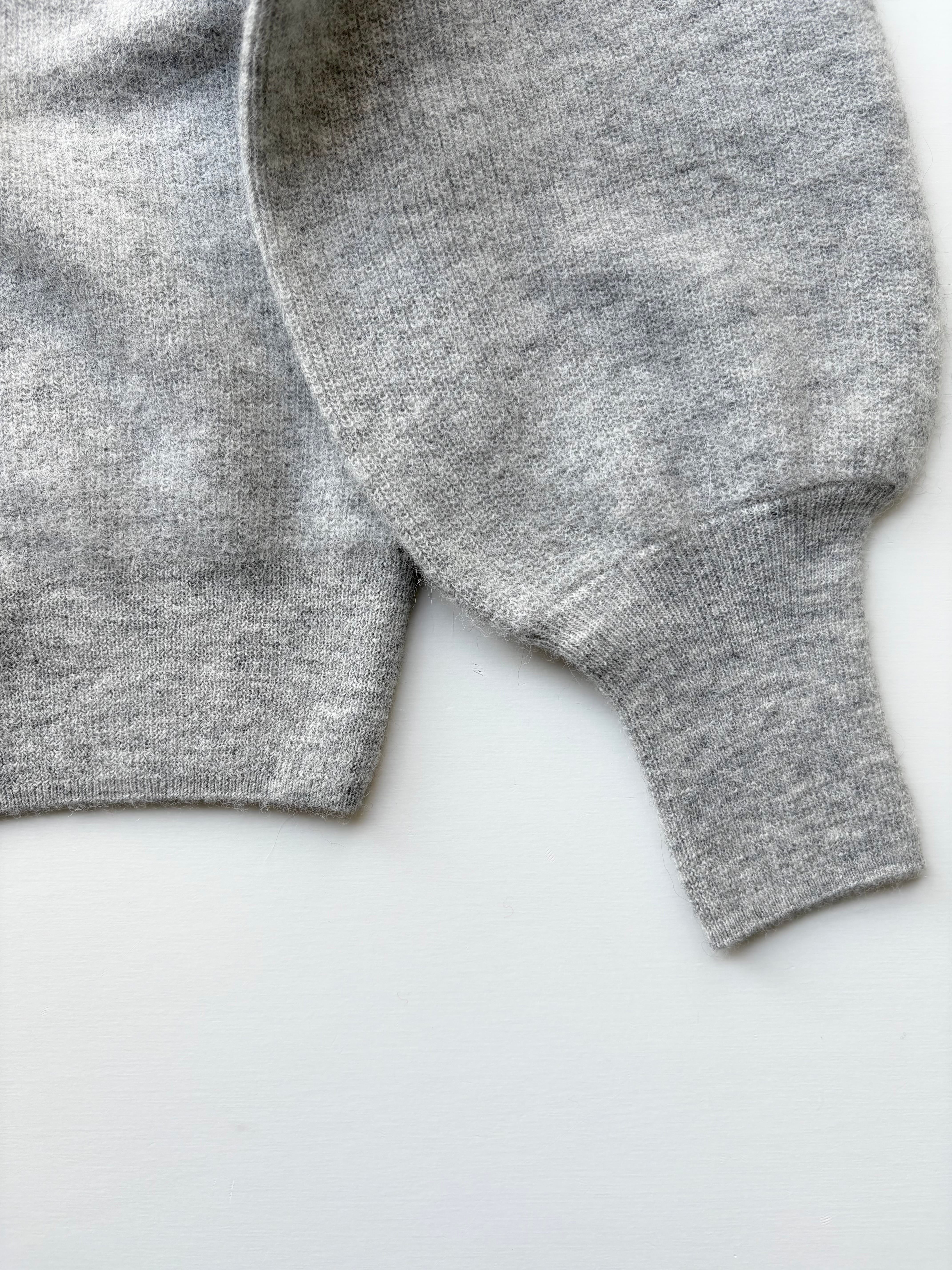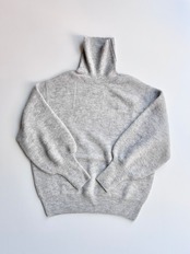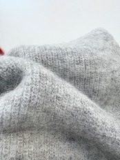 ベビーアルパカ、メリノウールという高級獣毛のブランド糸で極小のブークレヤーンを作り、それを起毛させたタムタムヤーンで編み立てたニット。