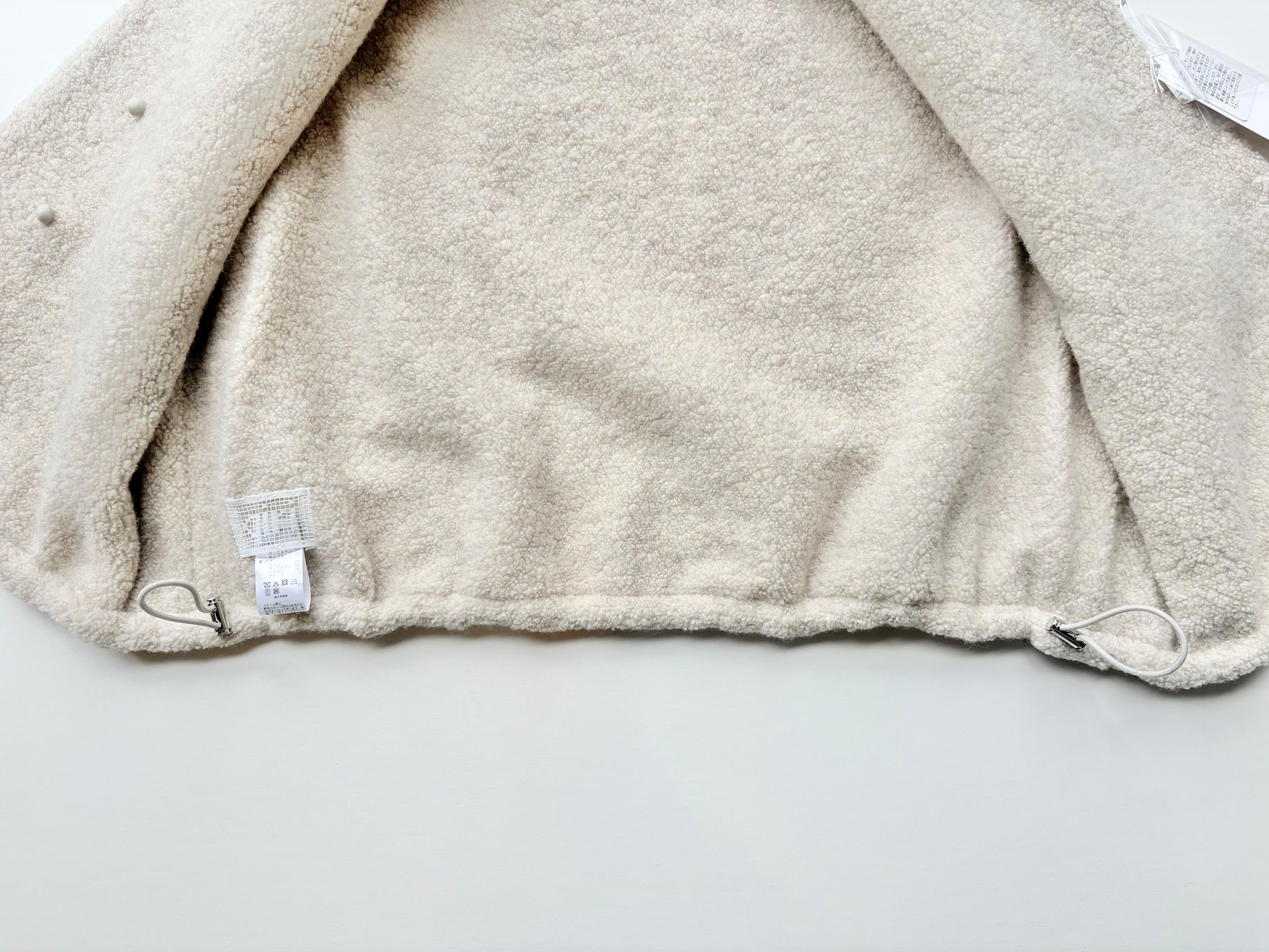 短めの丈でボリュームのあるパンツやスカートにも相性良くコーディネートでき、ジャガード面とボア面2WAYでお楽しみいただけ、また、ウエストのコードを絞りブラウジングしてシルエットを変えることも。