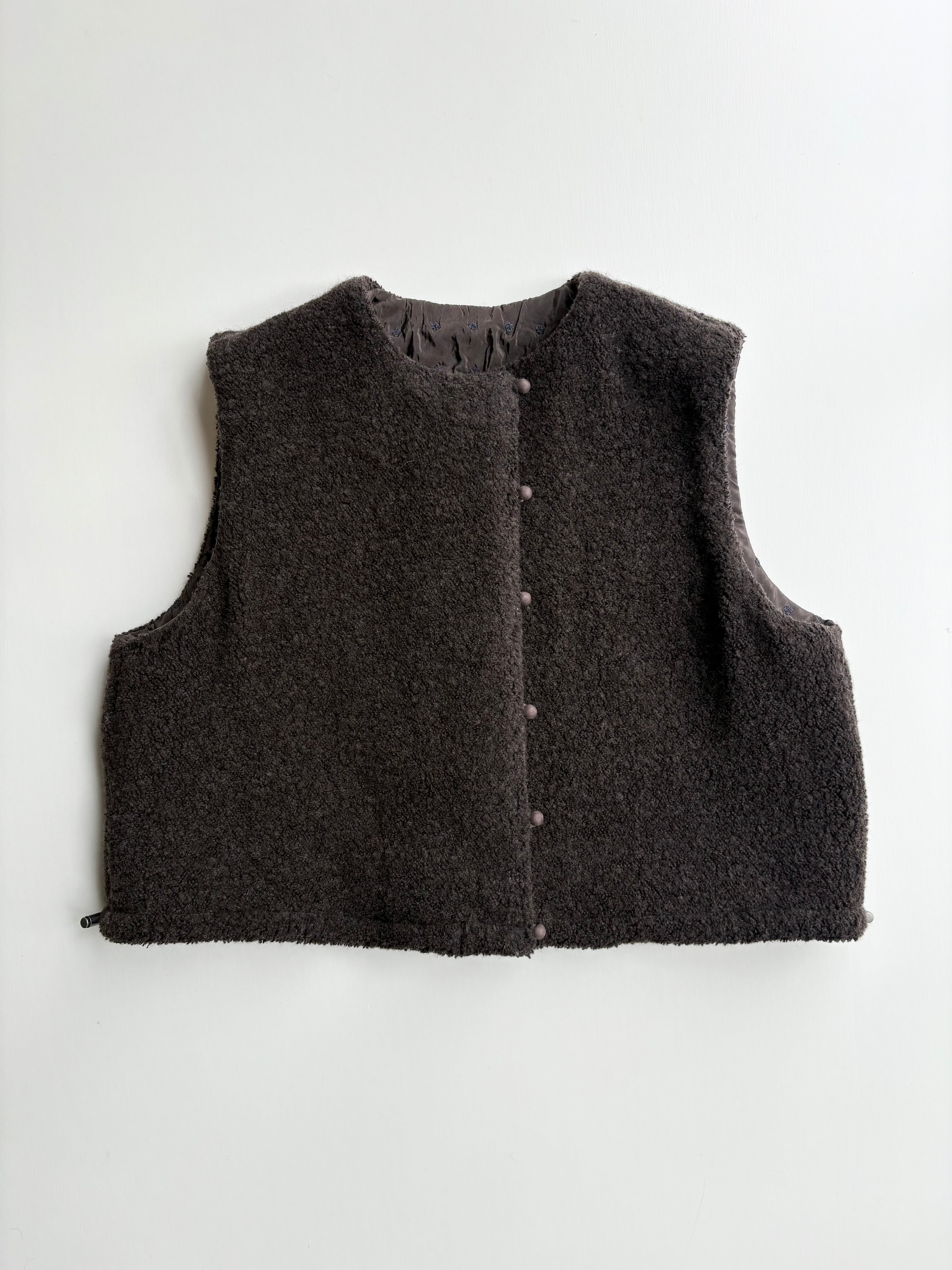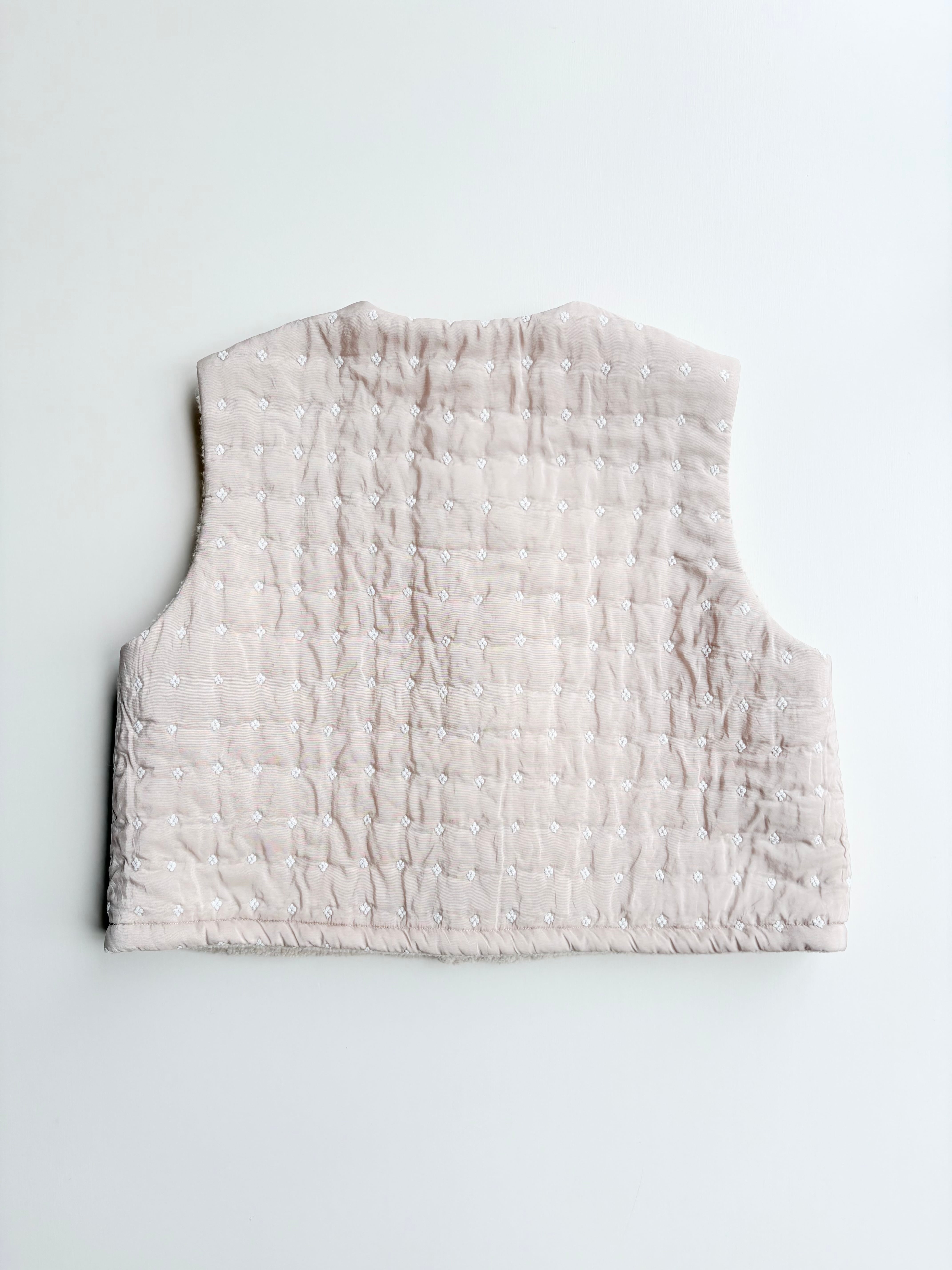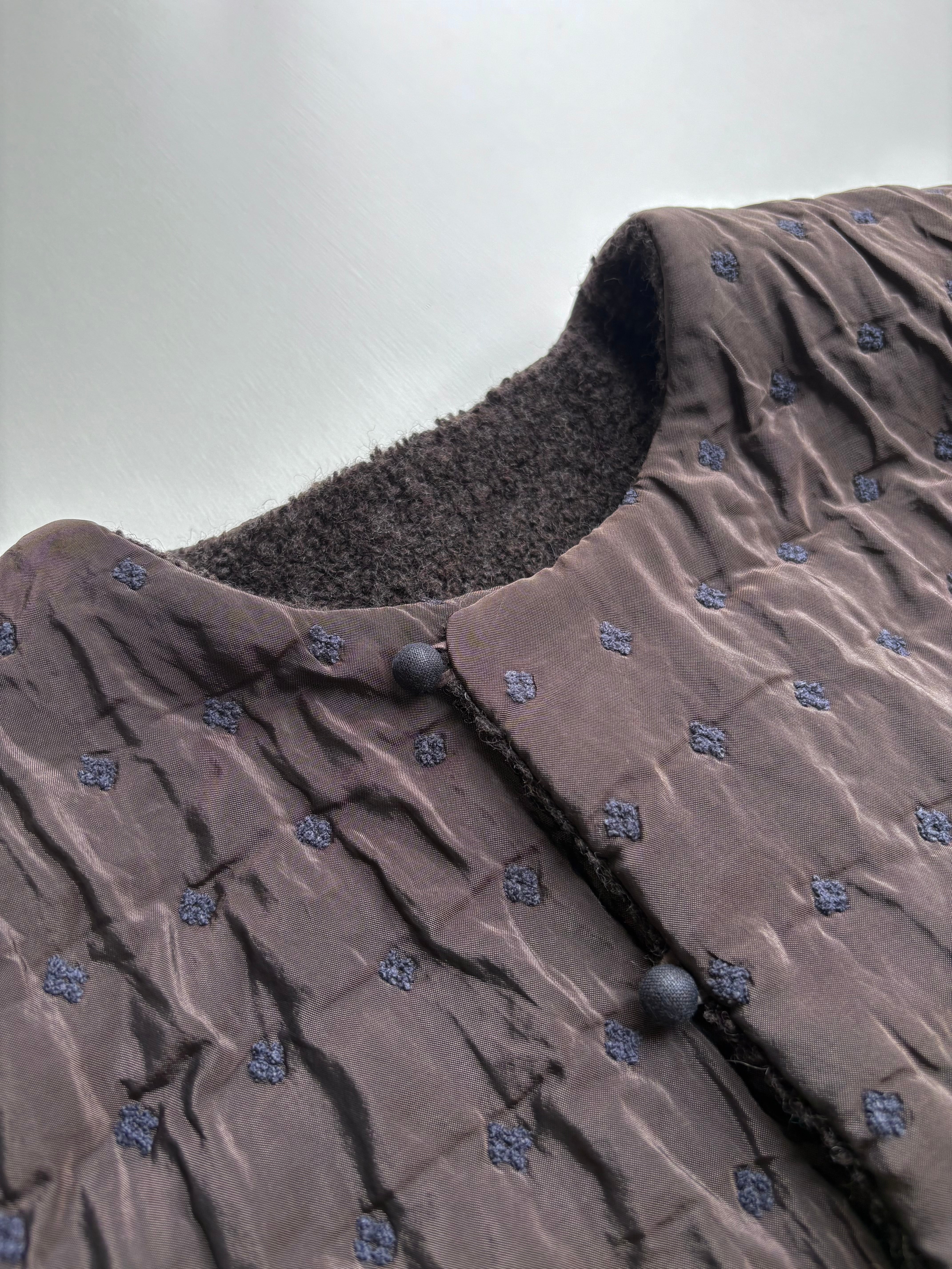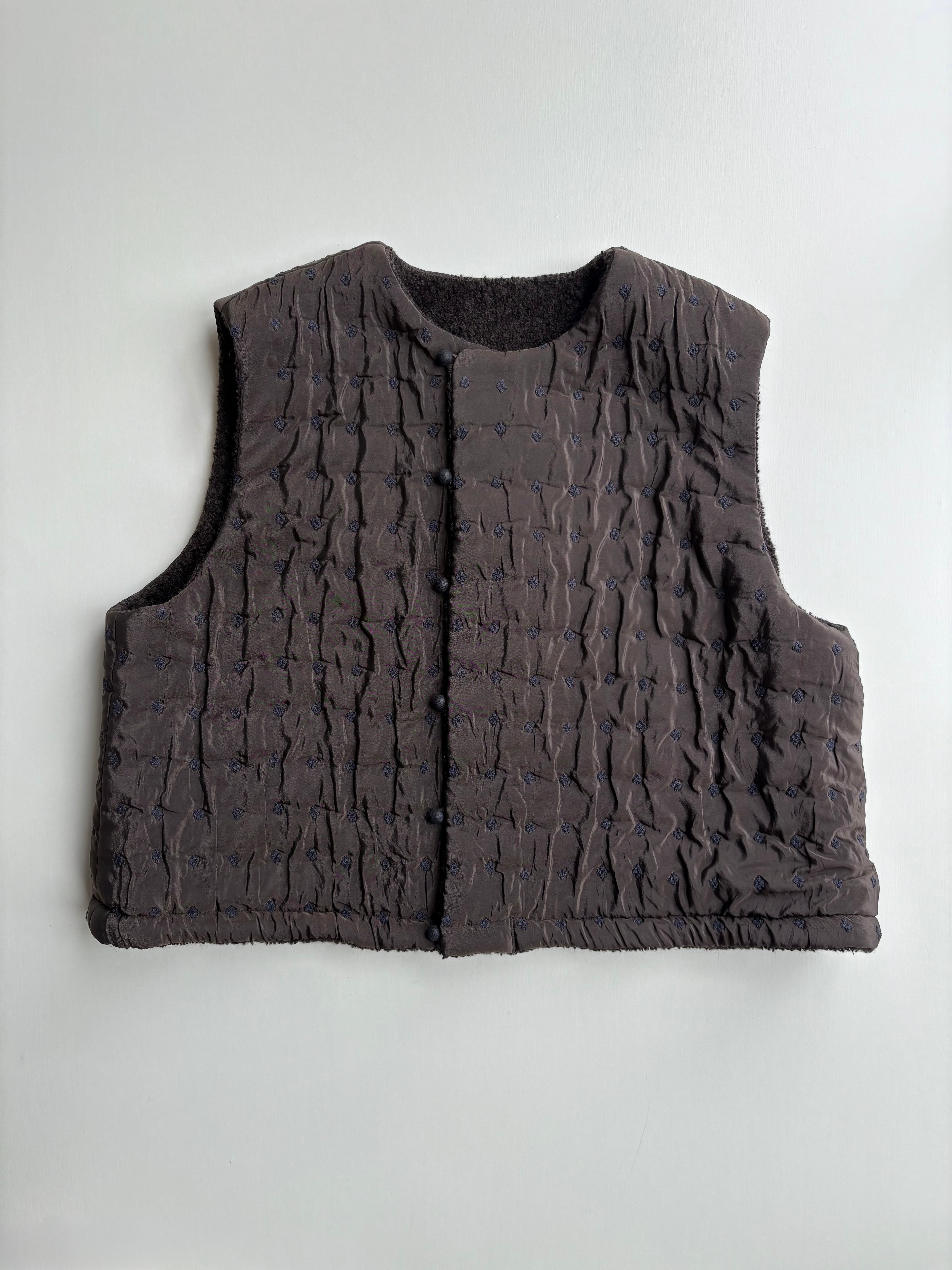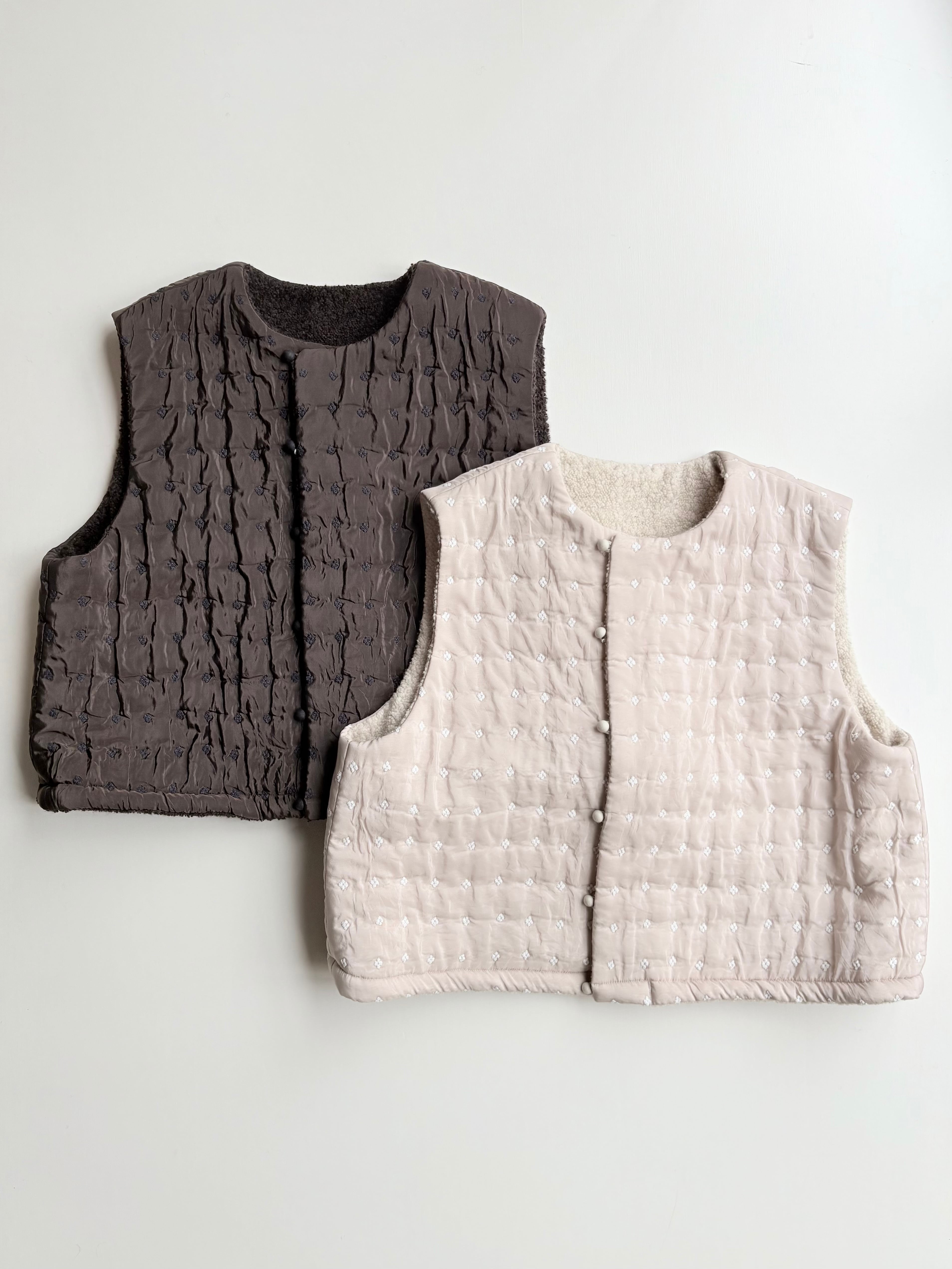 ドットのようなぷっくりとした小さなお花でキルトを施したようなジャガードテキスタイルに、内側にはウールのボア生地を使用したリバーシブルベスト。