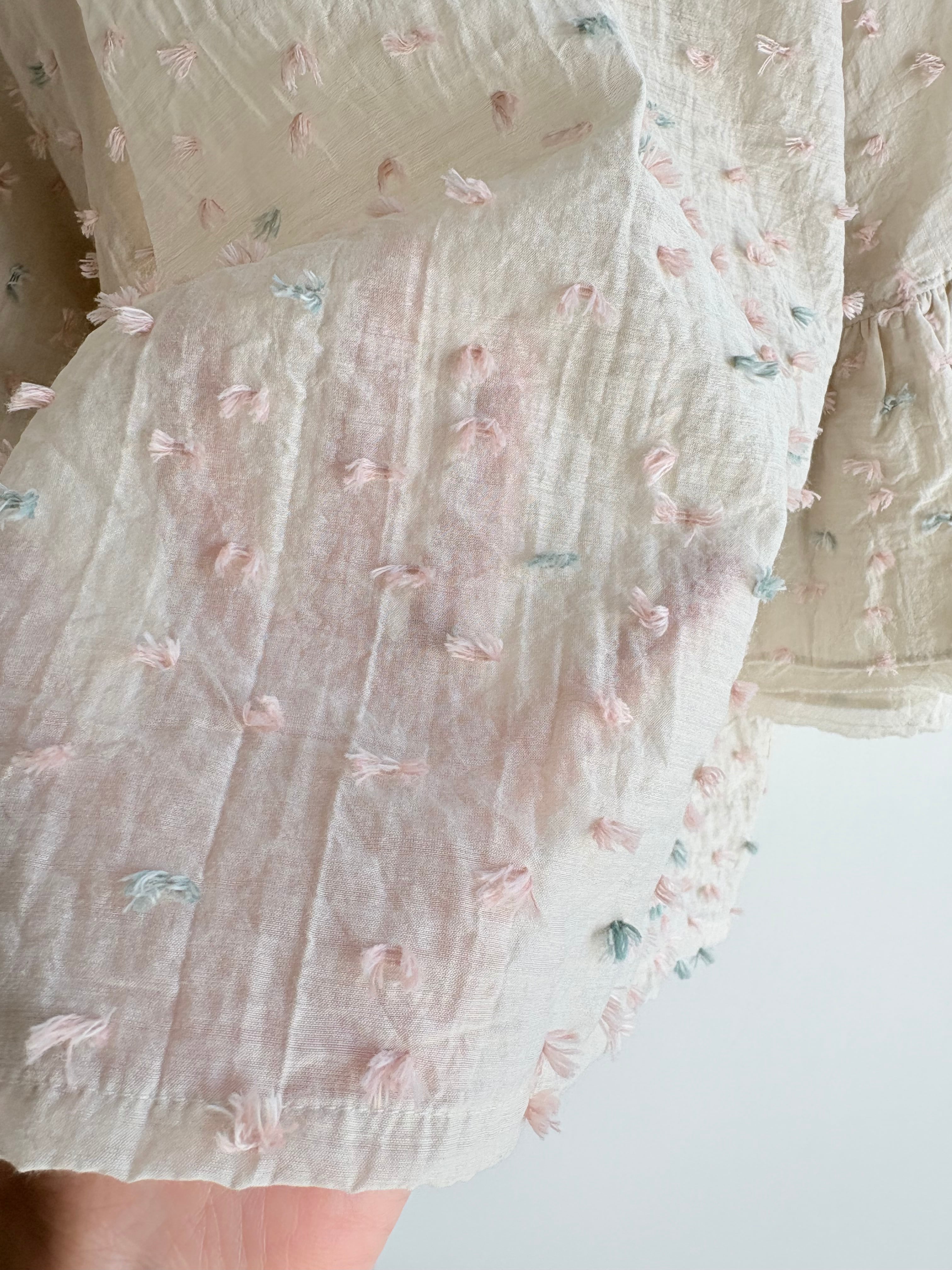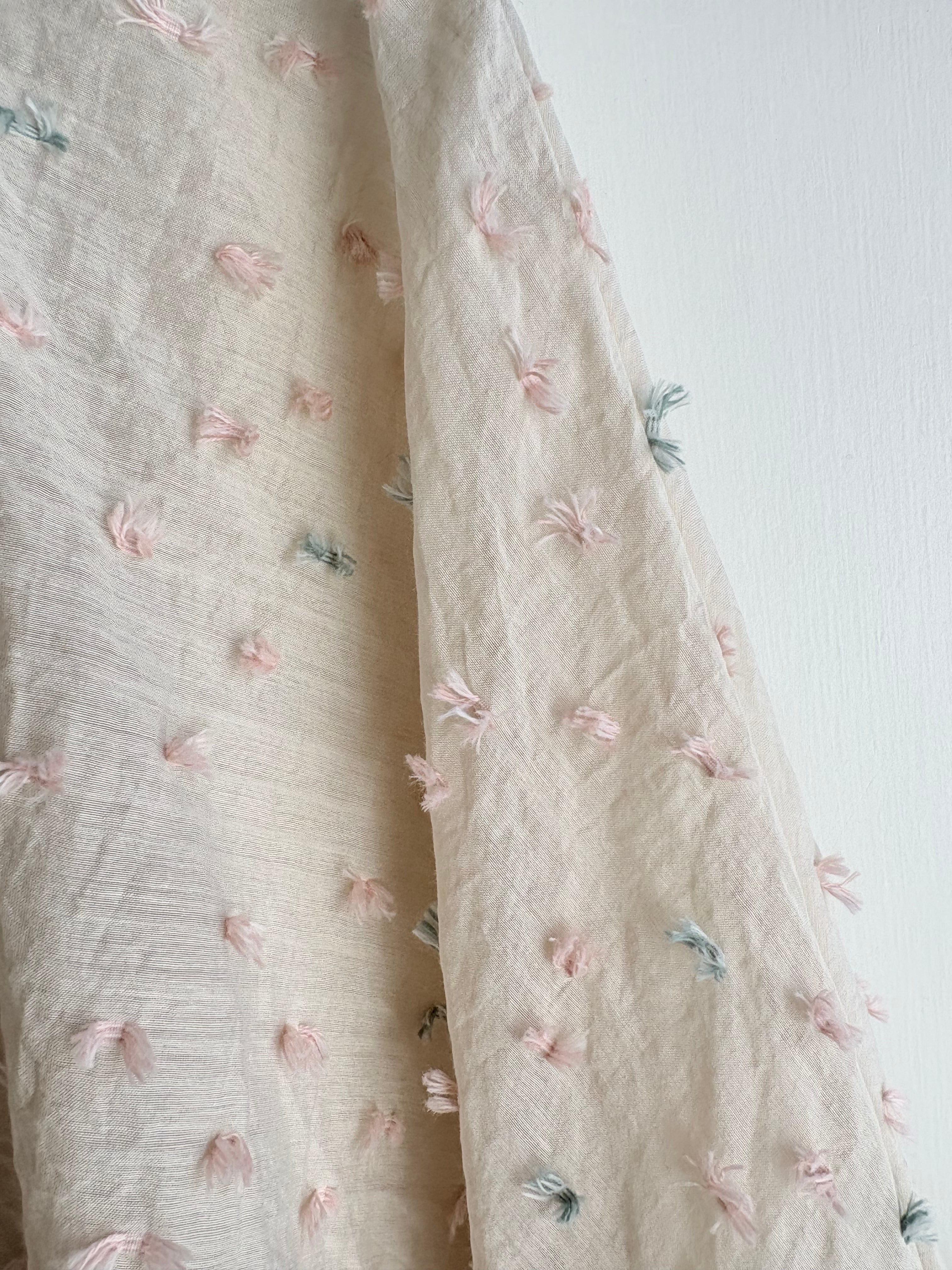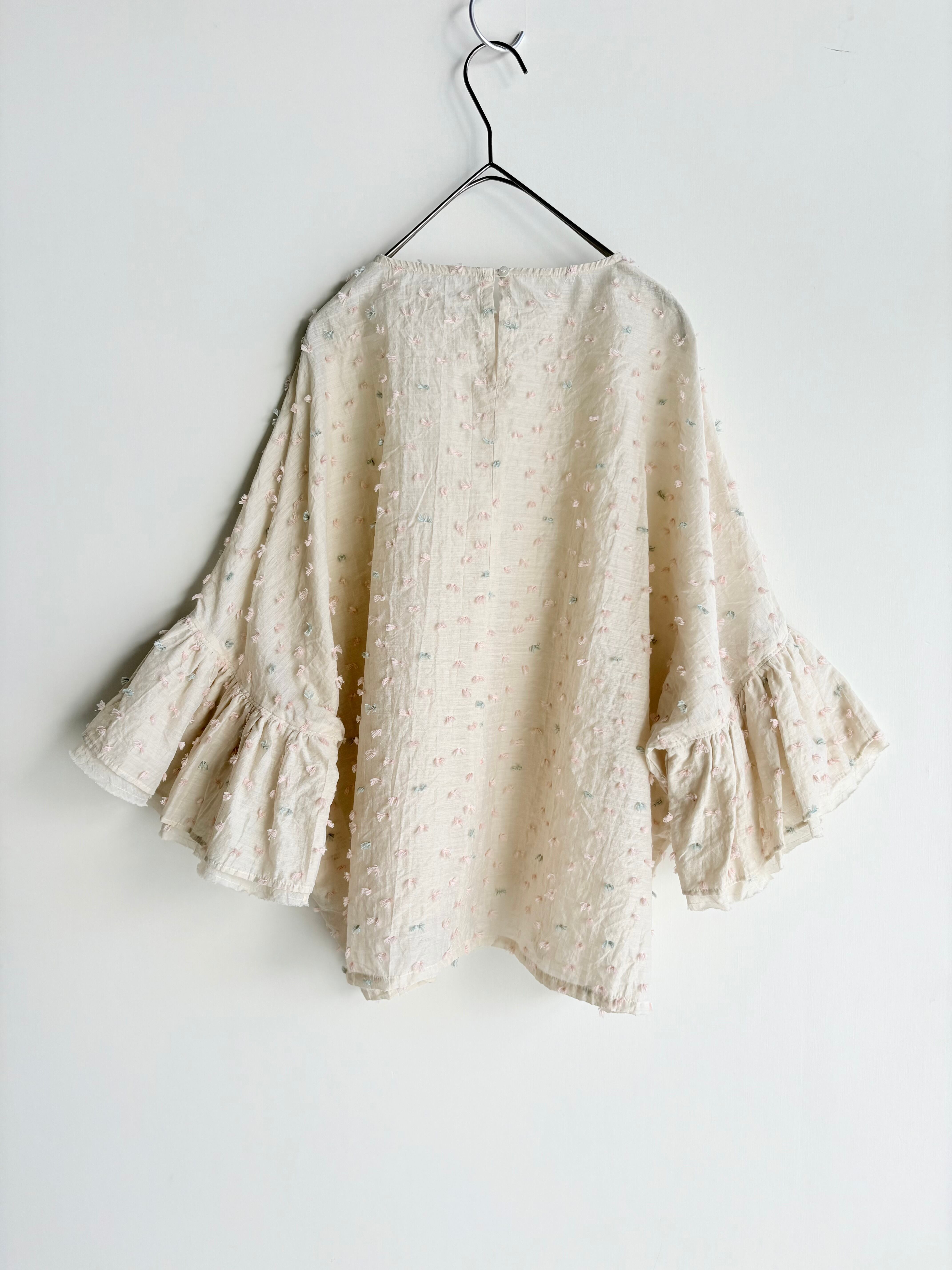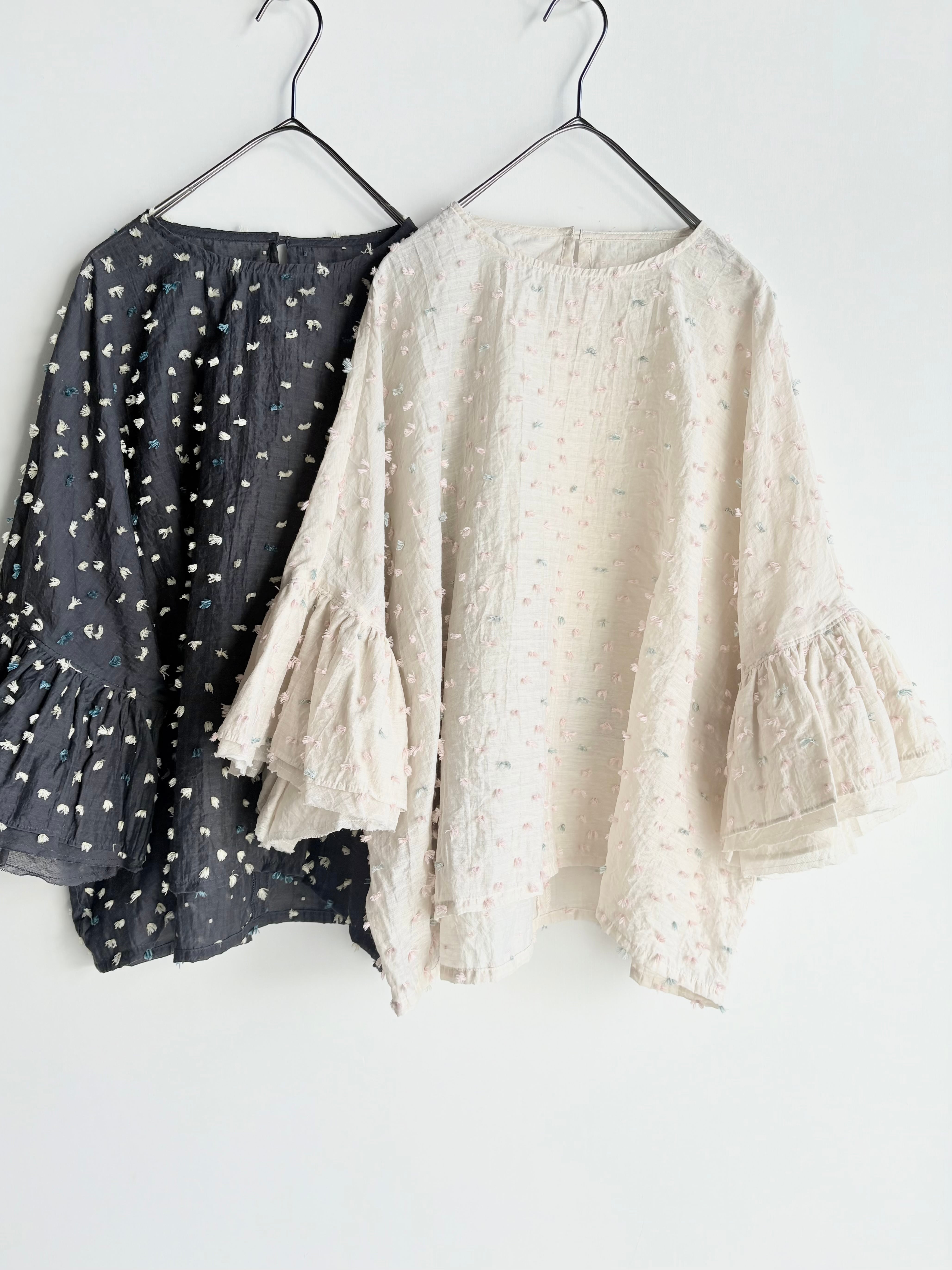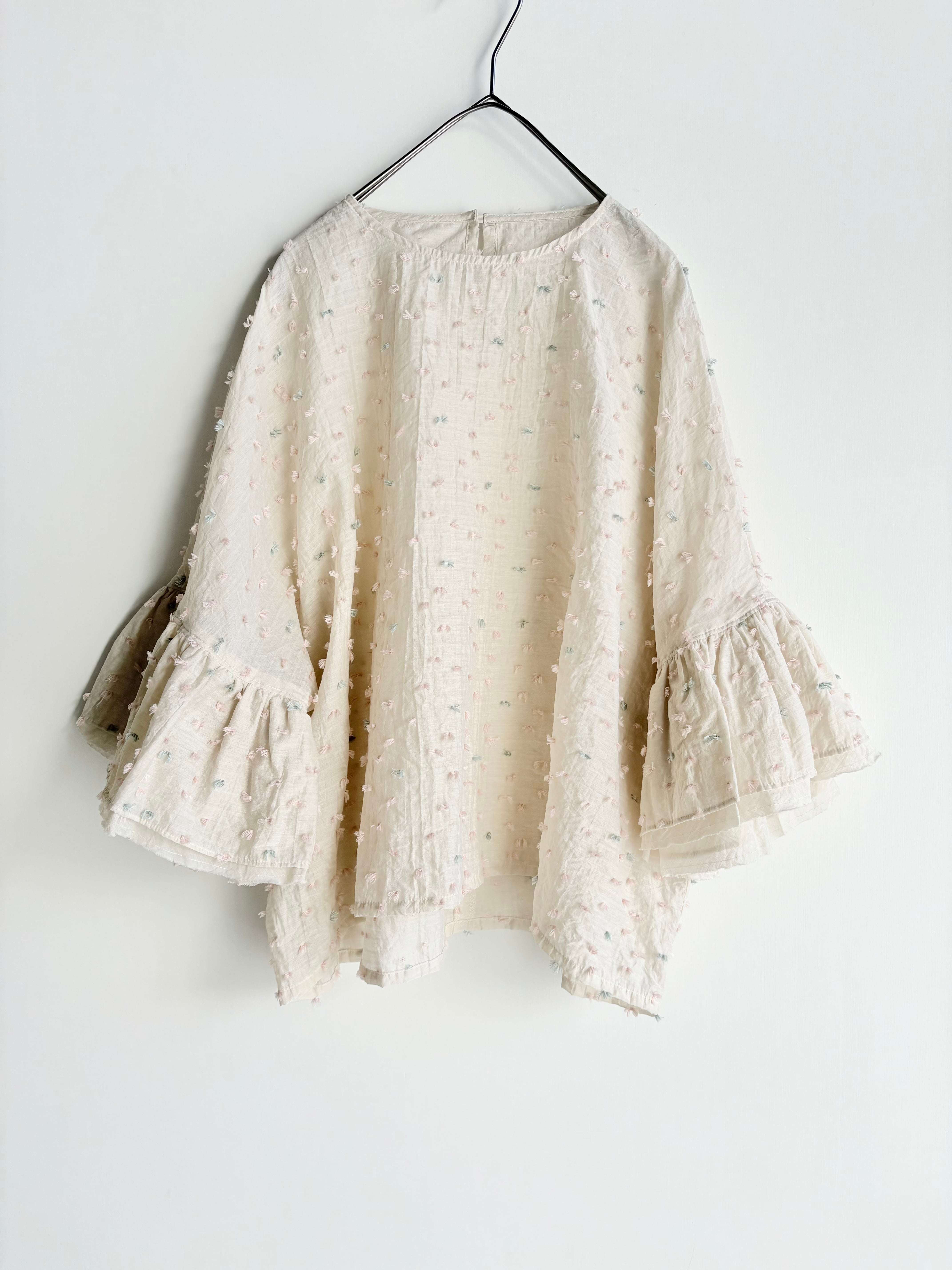 花びらが風に乗って舞う様子を表現したカットジャガード生地で仕立てたフリルブラウス。