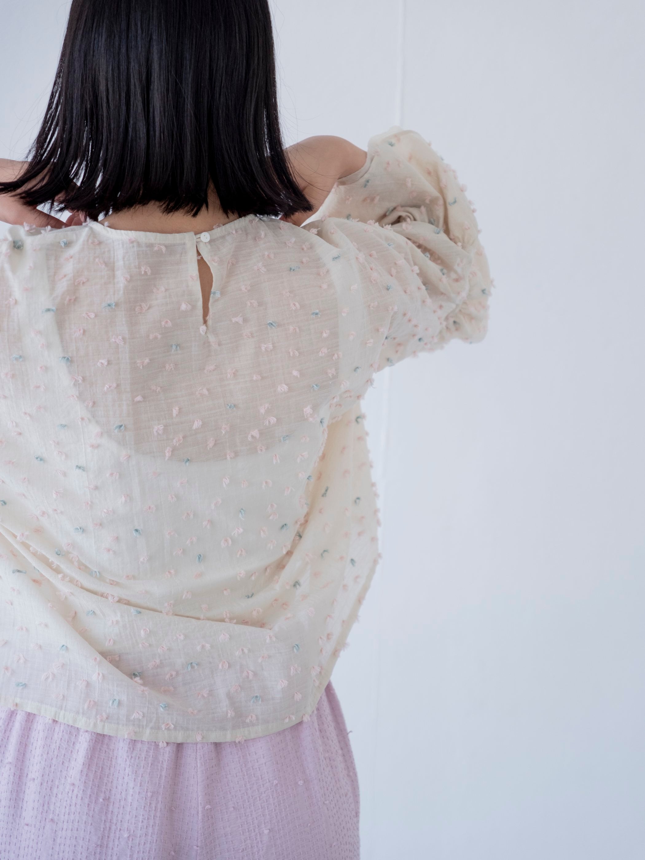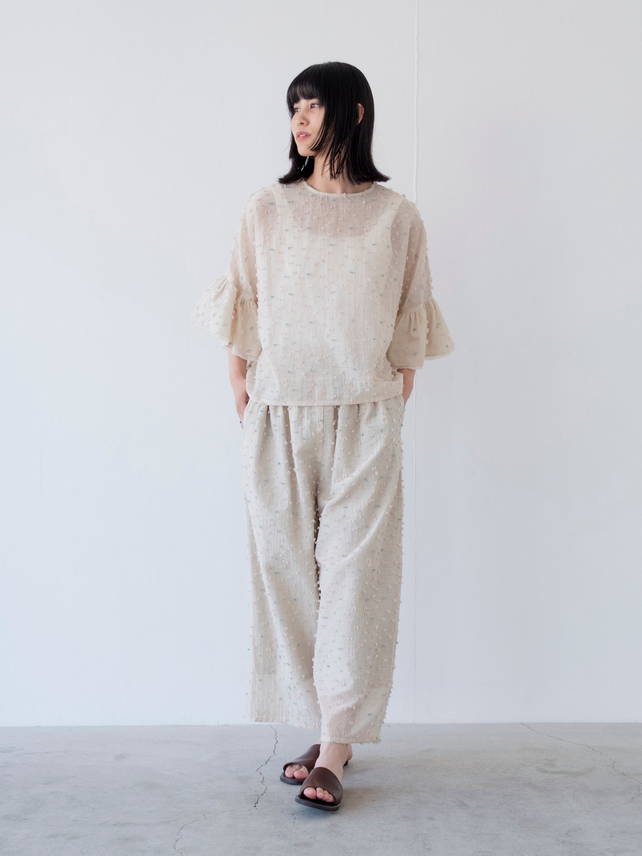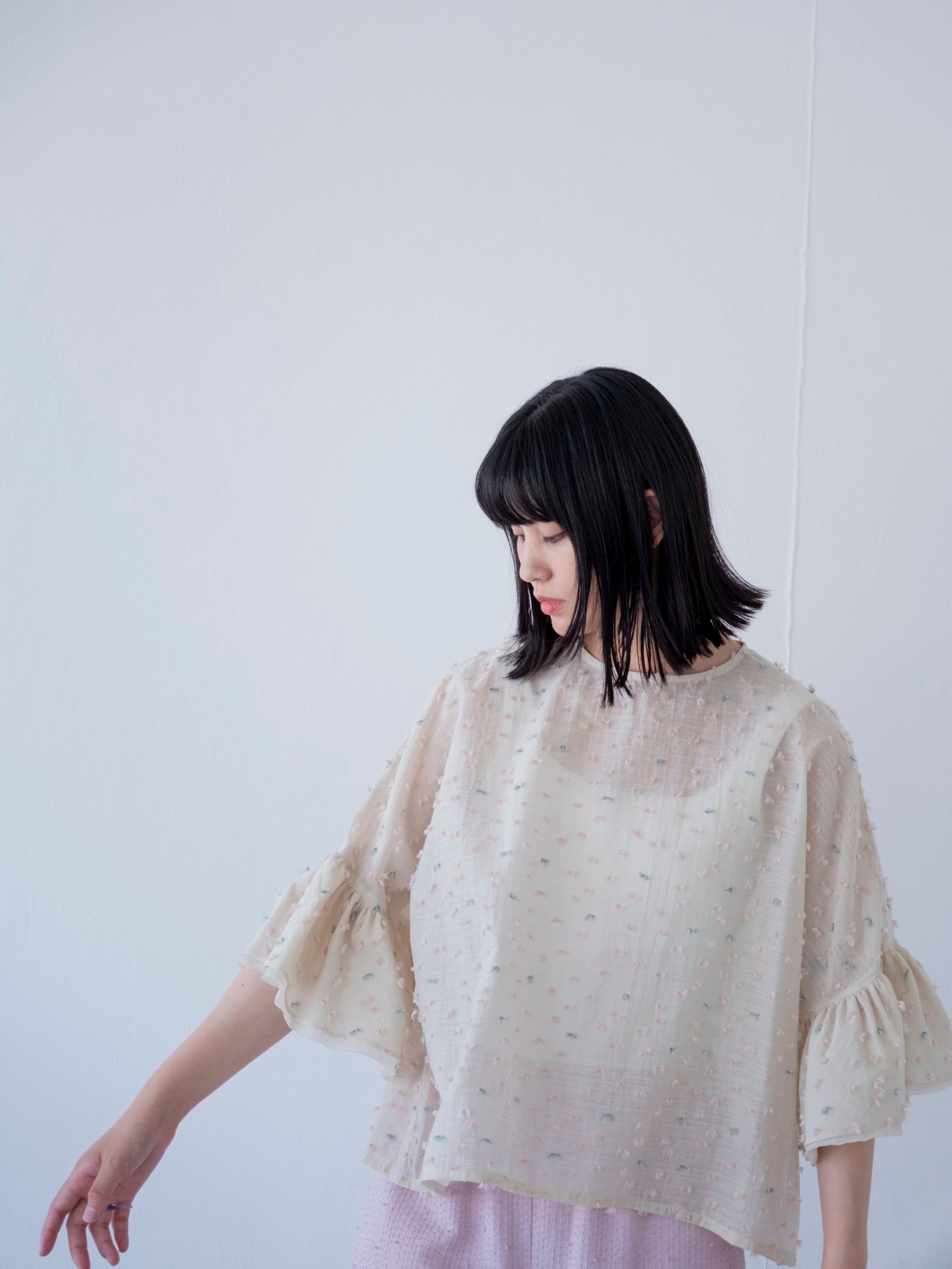 ゆったりとした身幅に、フリルの袖。