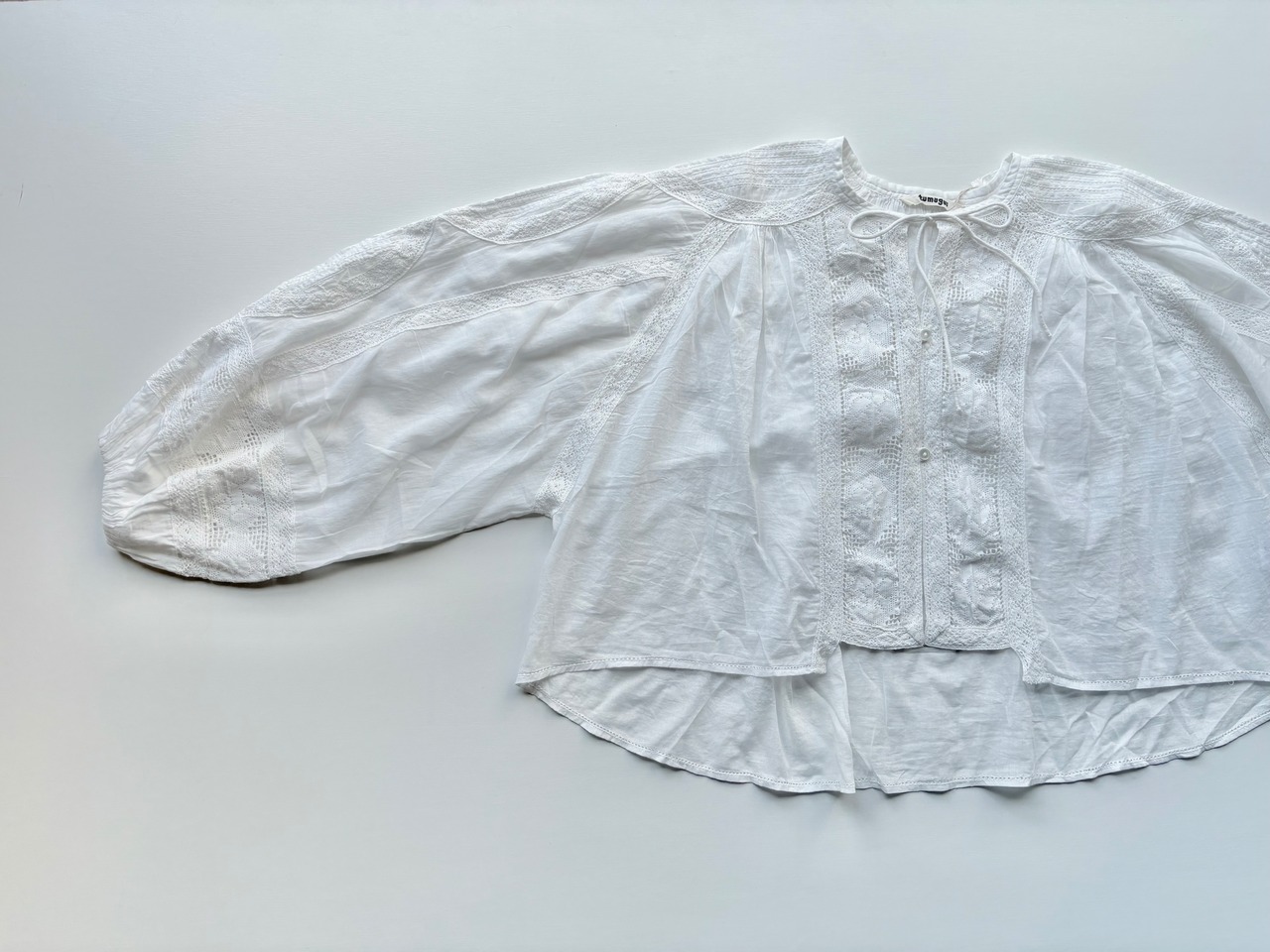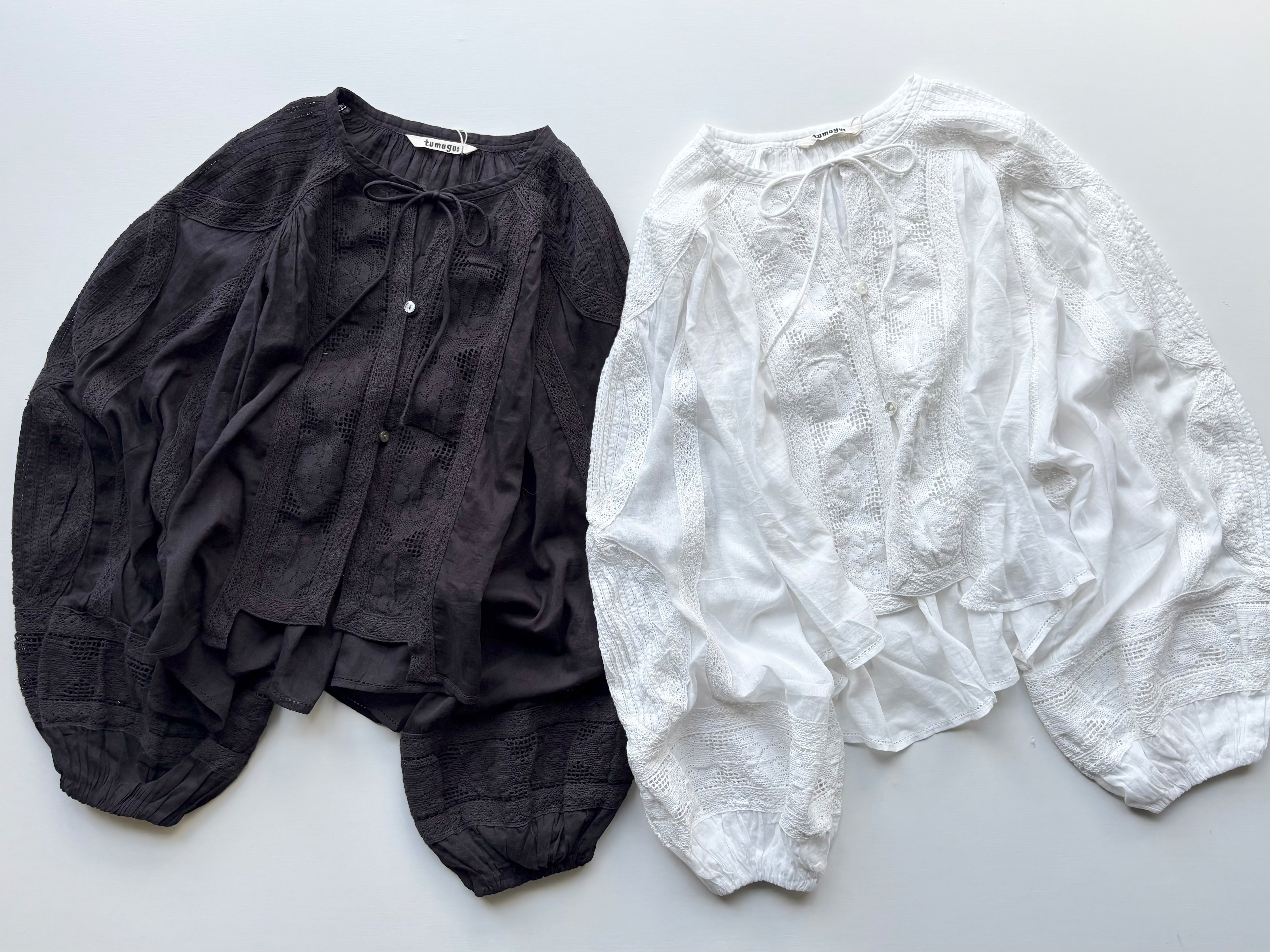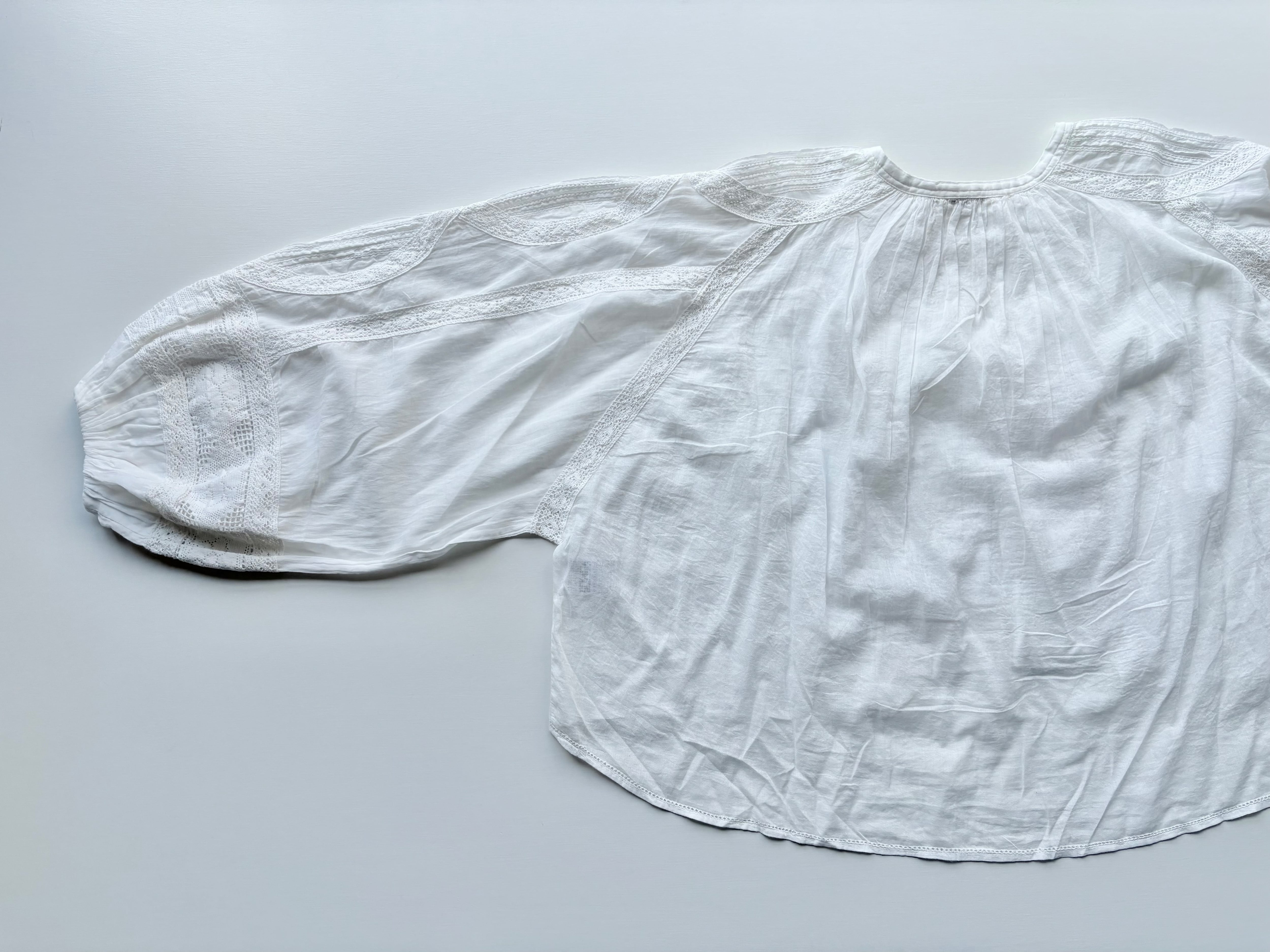 肩から袖口にかけてたっぷりと生地を使い、ぽわんと膨らむボリューム袖に仕上げました。贅沢なレース使いが手を美しく彩ります。