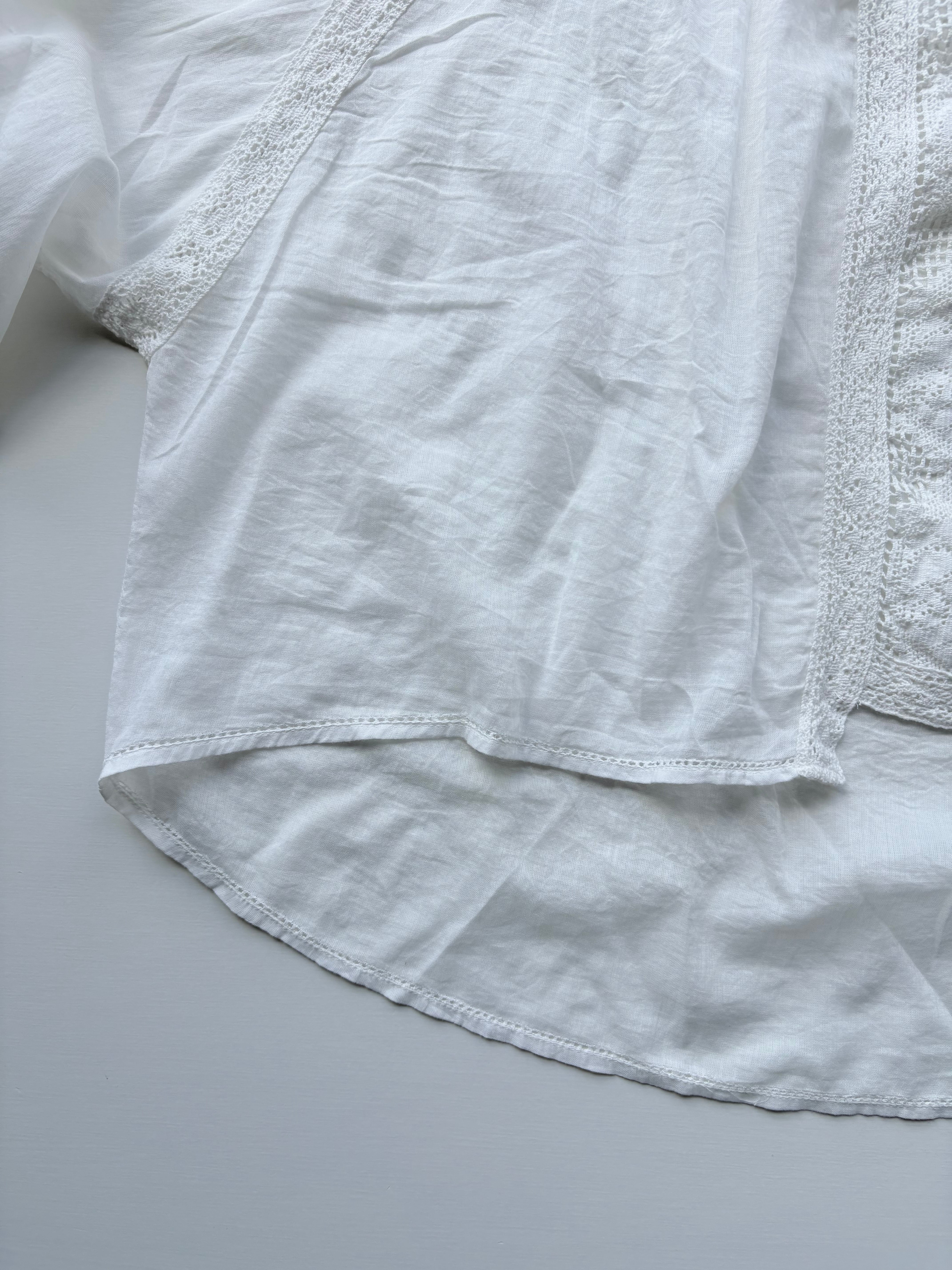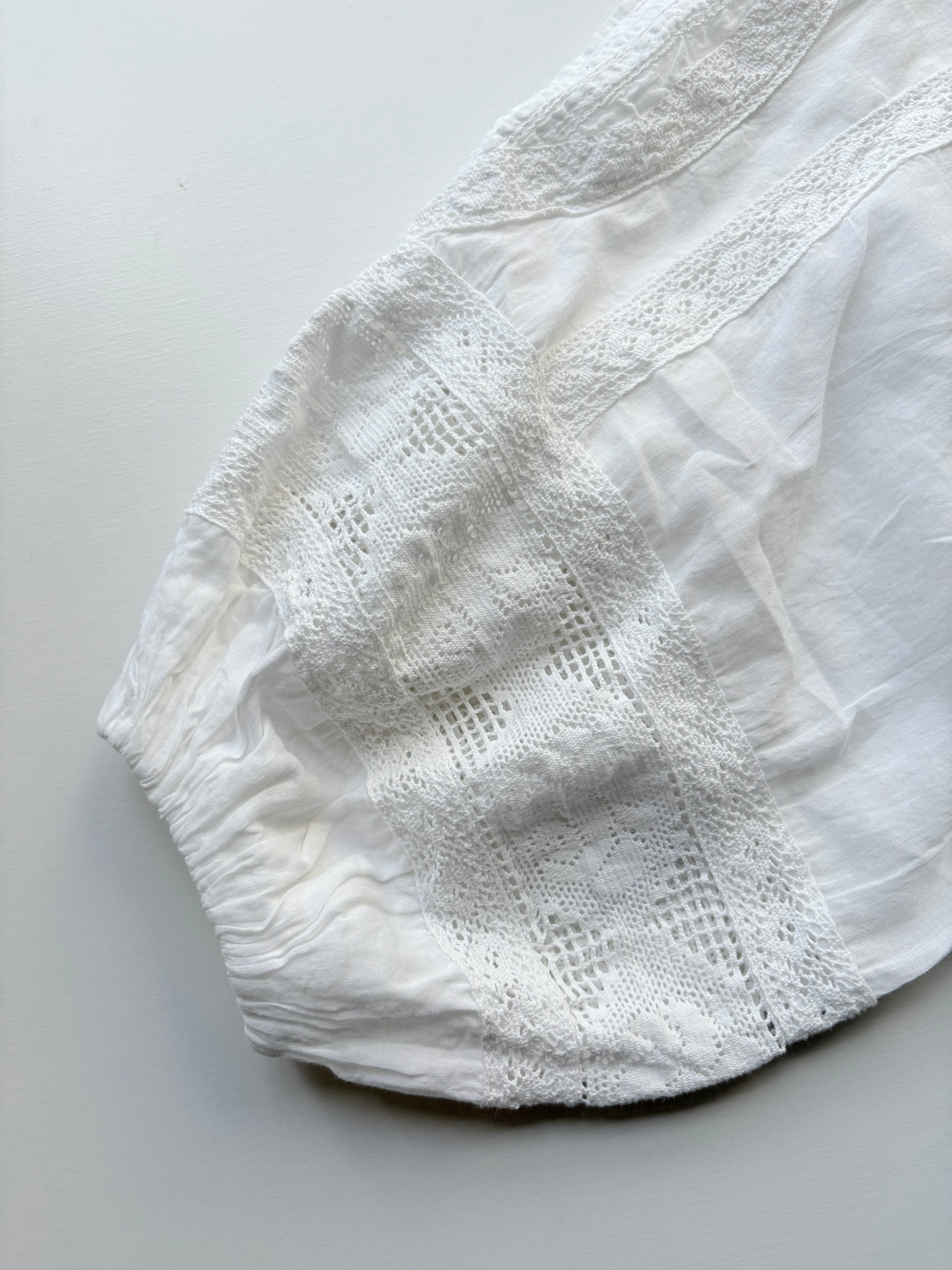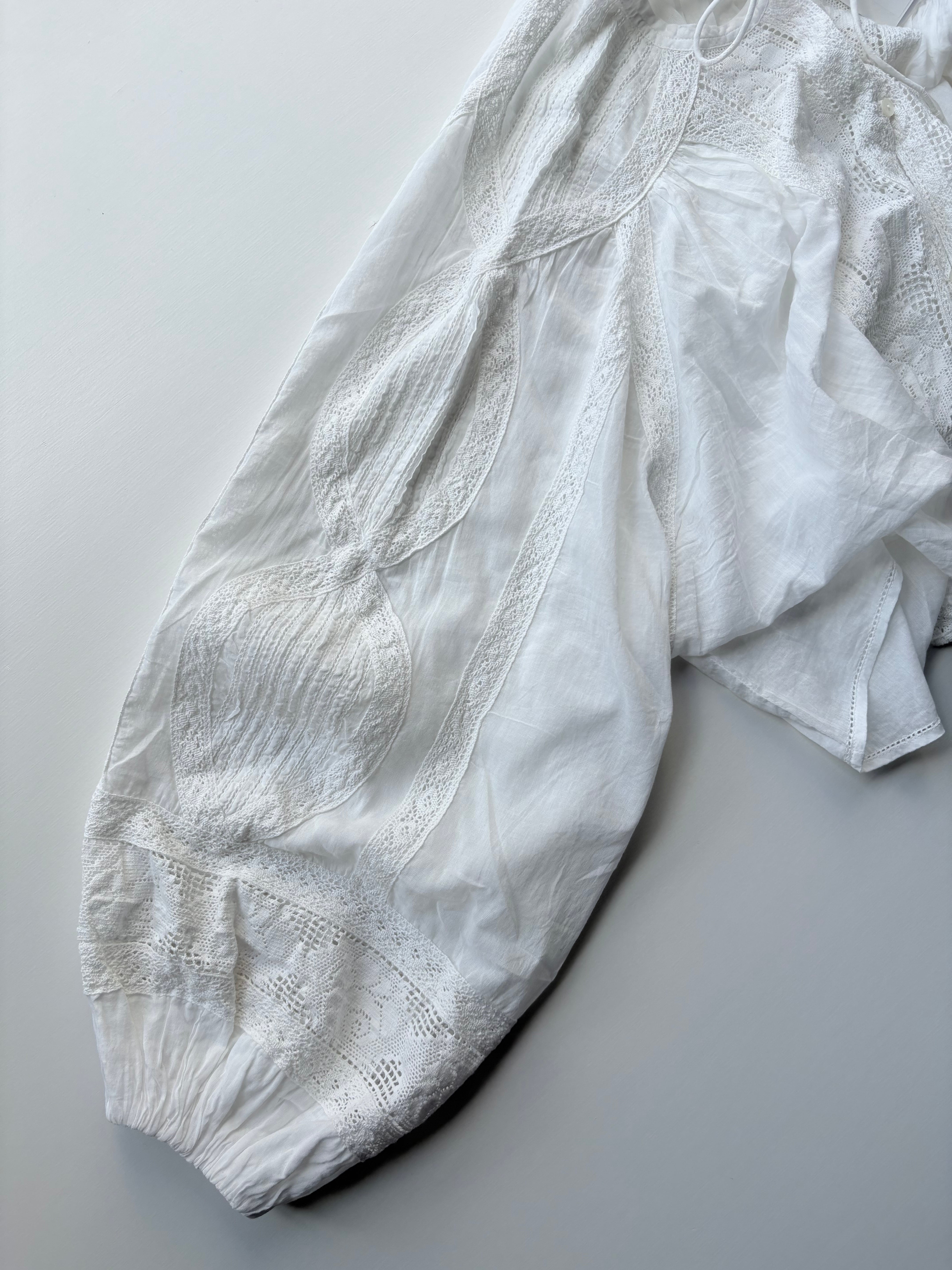 肩から袖口にかけてたっぷりと生地を使い、ぽわんと膨らむボリューム袖に仕上げました。贅沢なレース使いが手を美しく彩ります。