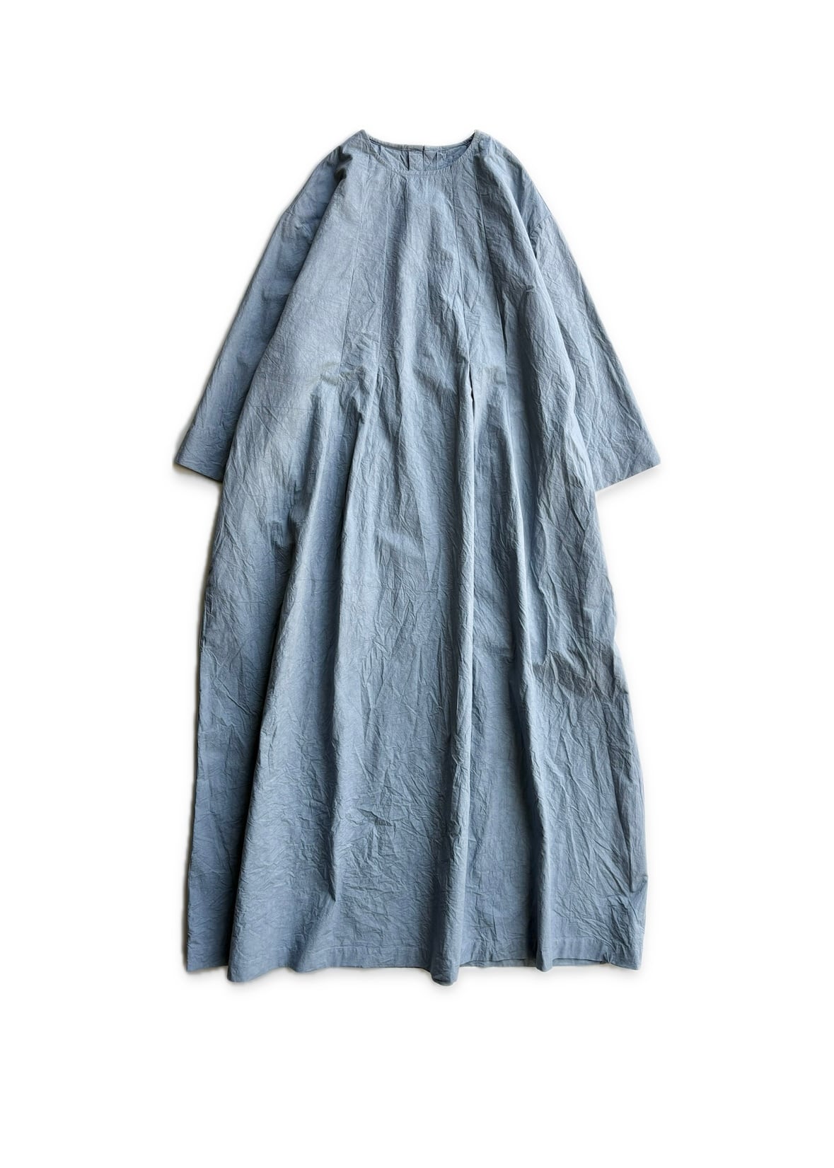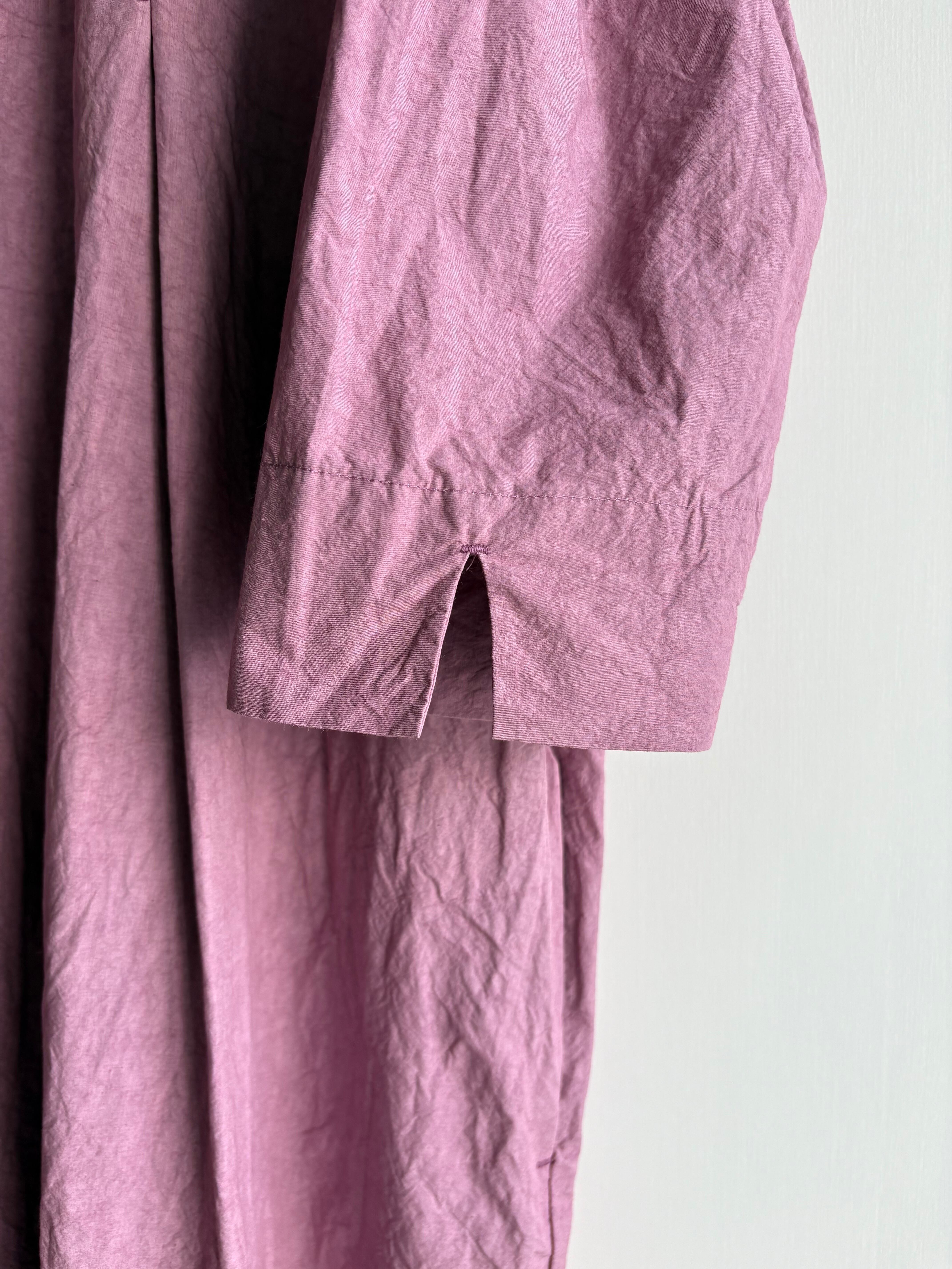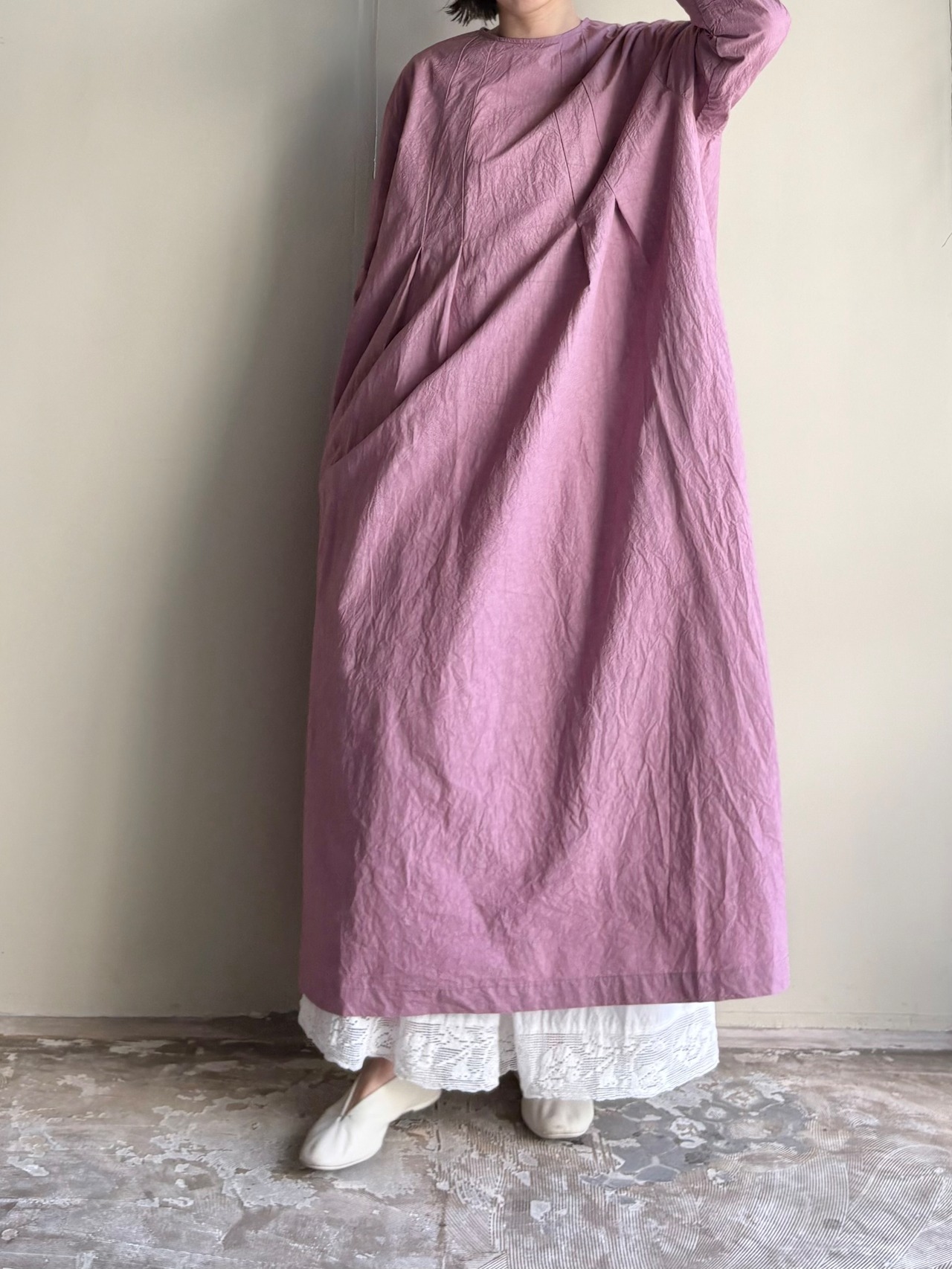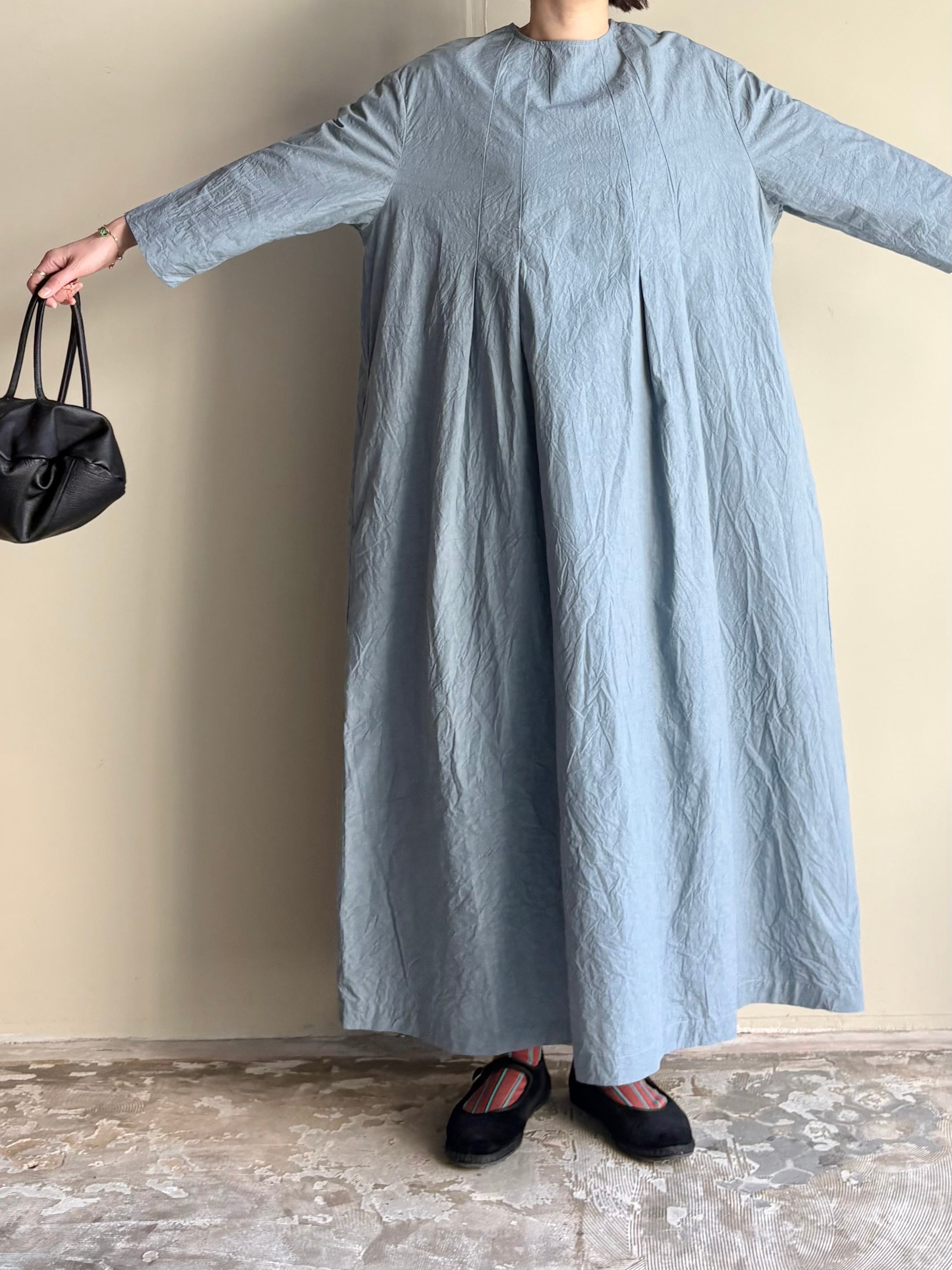 首元から入ったタックが裾に行くほどに綺麗なドレープを生み出し程よく広げ、ふんわりとしたシルエットの一枚。