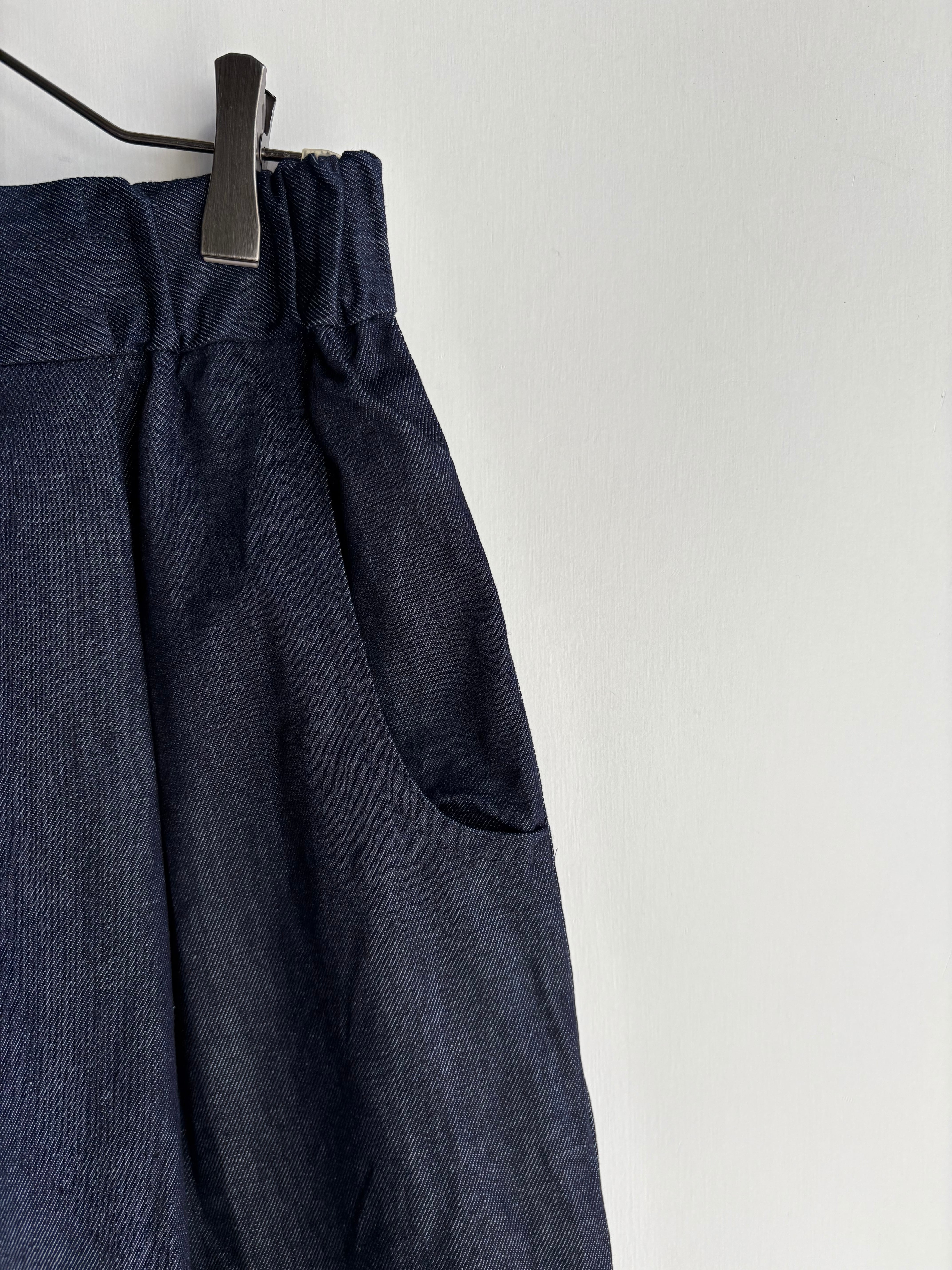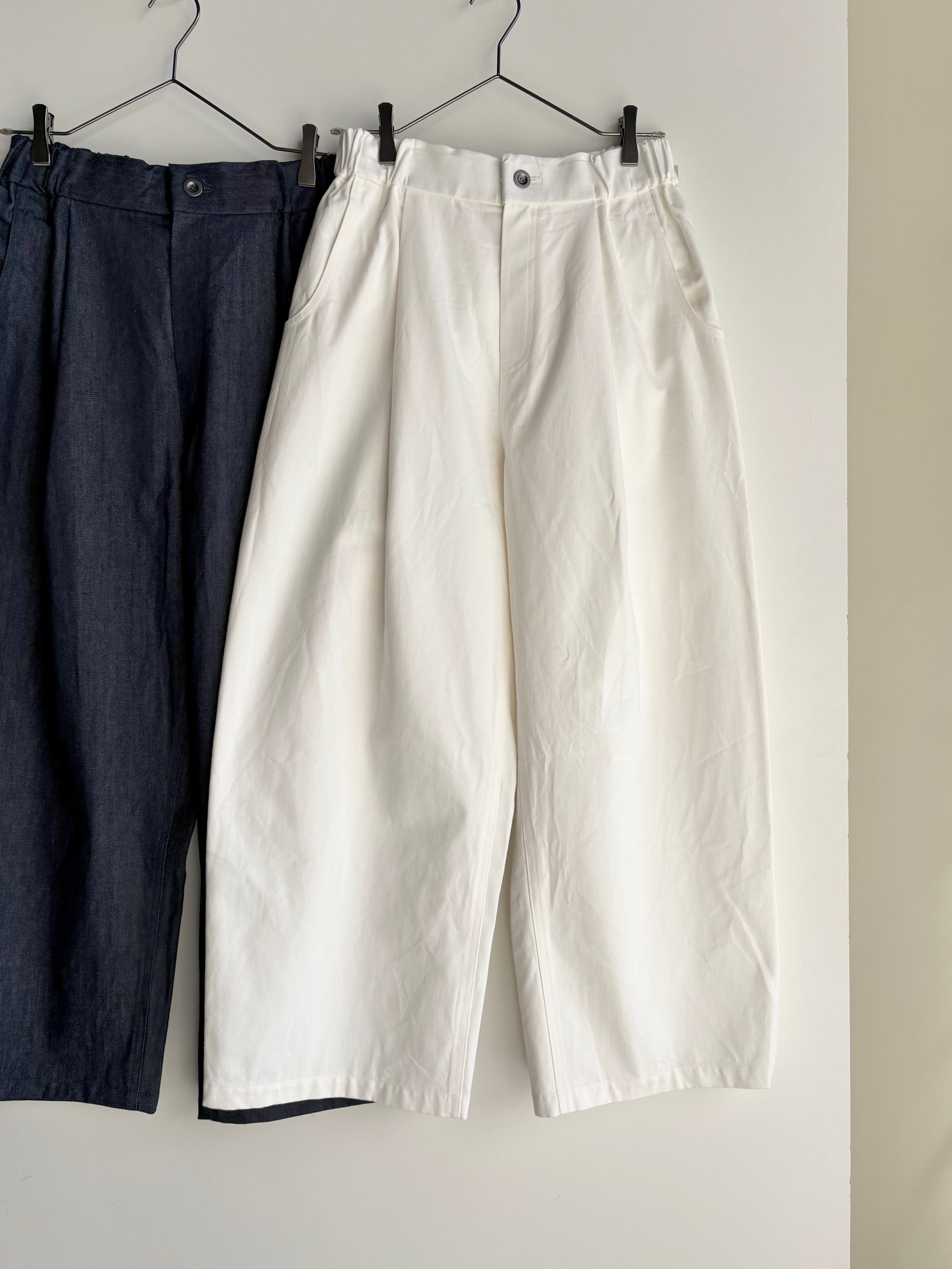 大人の抜け感を演出する、デニム素材のカーブパンツ。