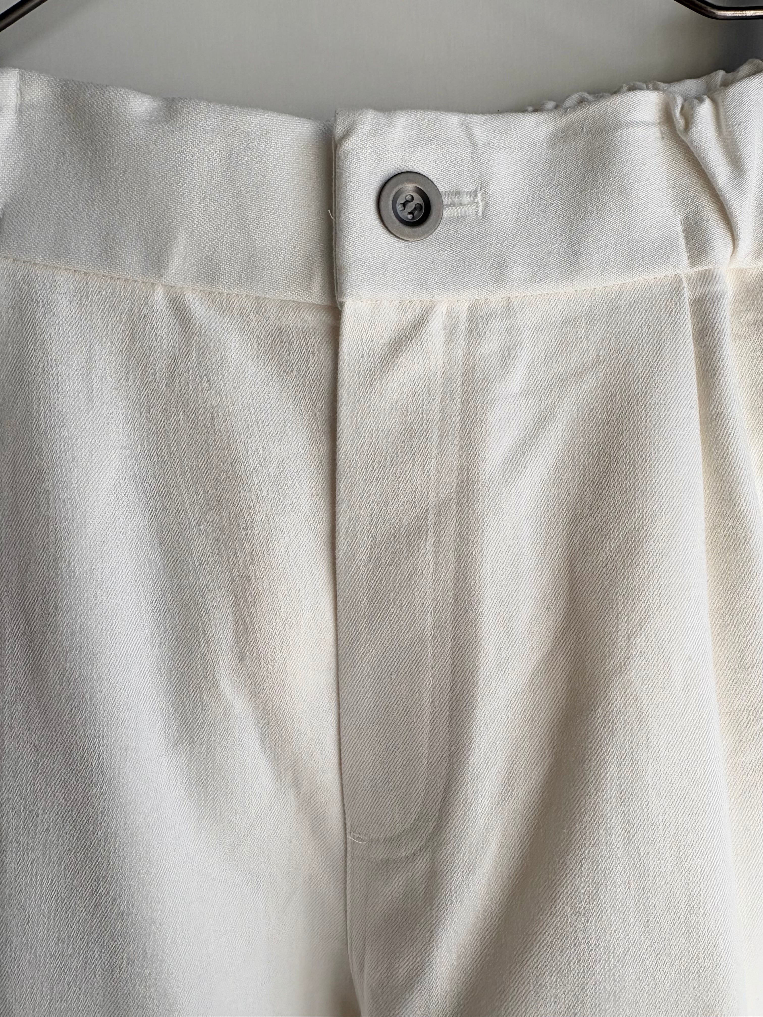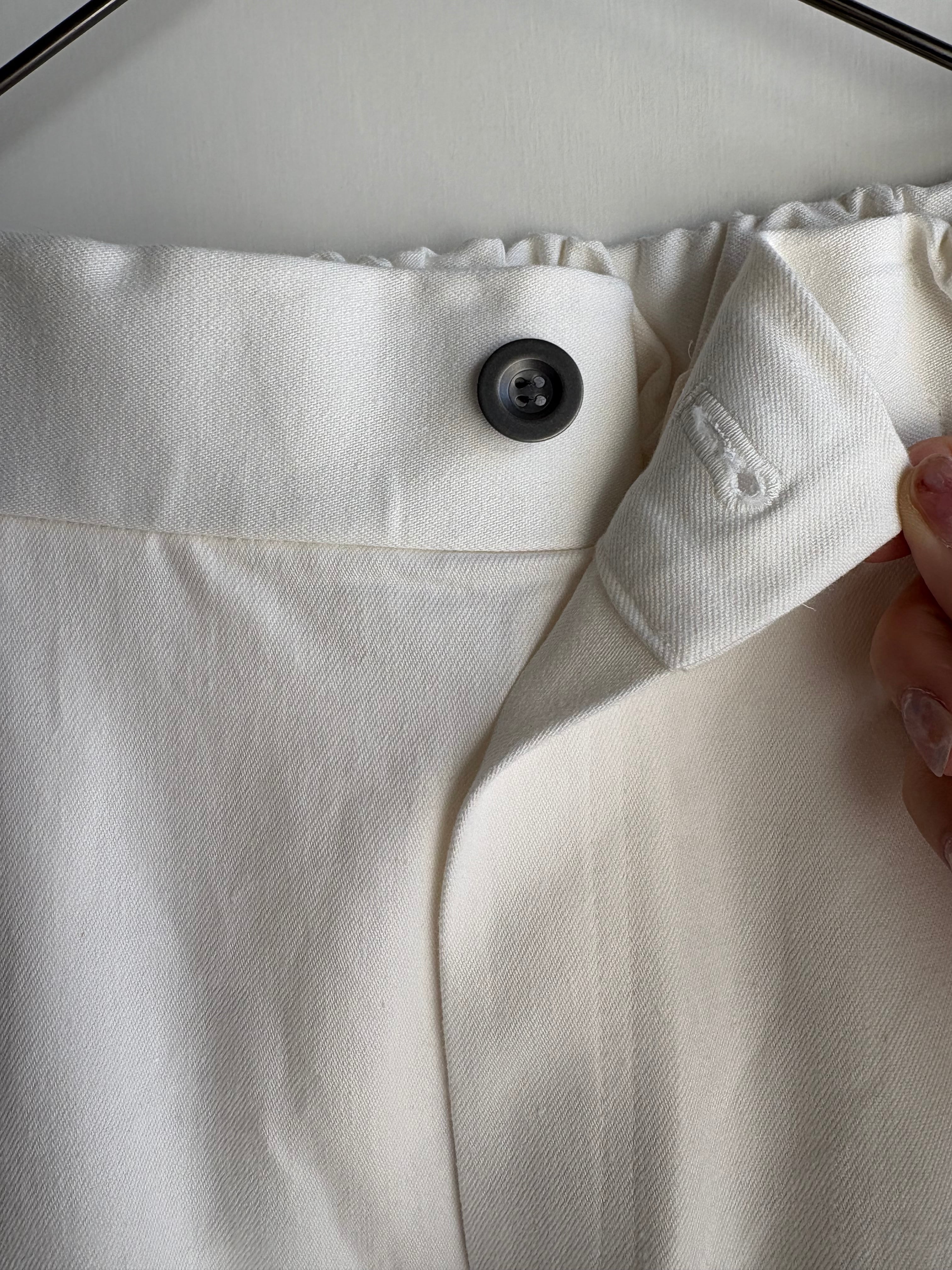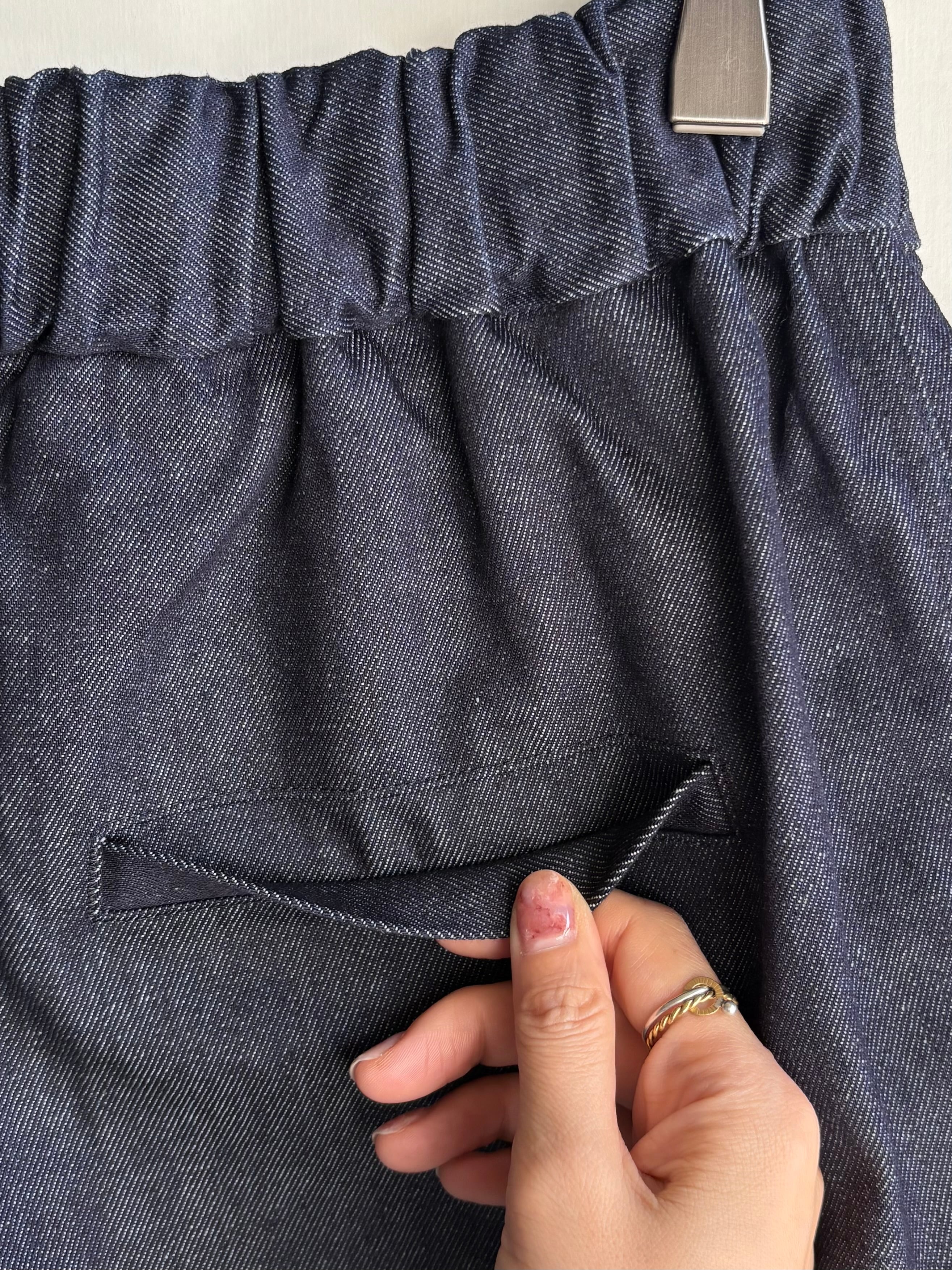 フロントはフェイクの前立てデザインでスッキリと見せながらも、ゴムと紐で調整でき脱着しやすいキレイと楽チンを兼ね備えたパンツです。