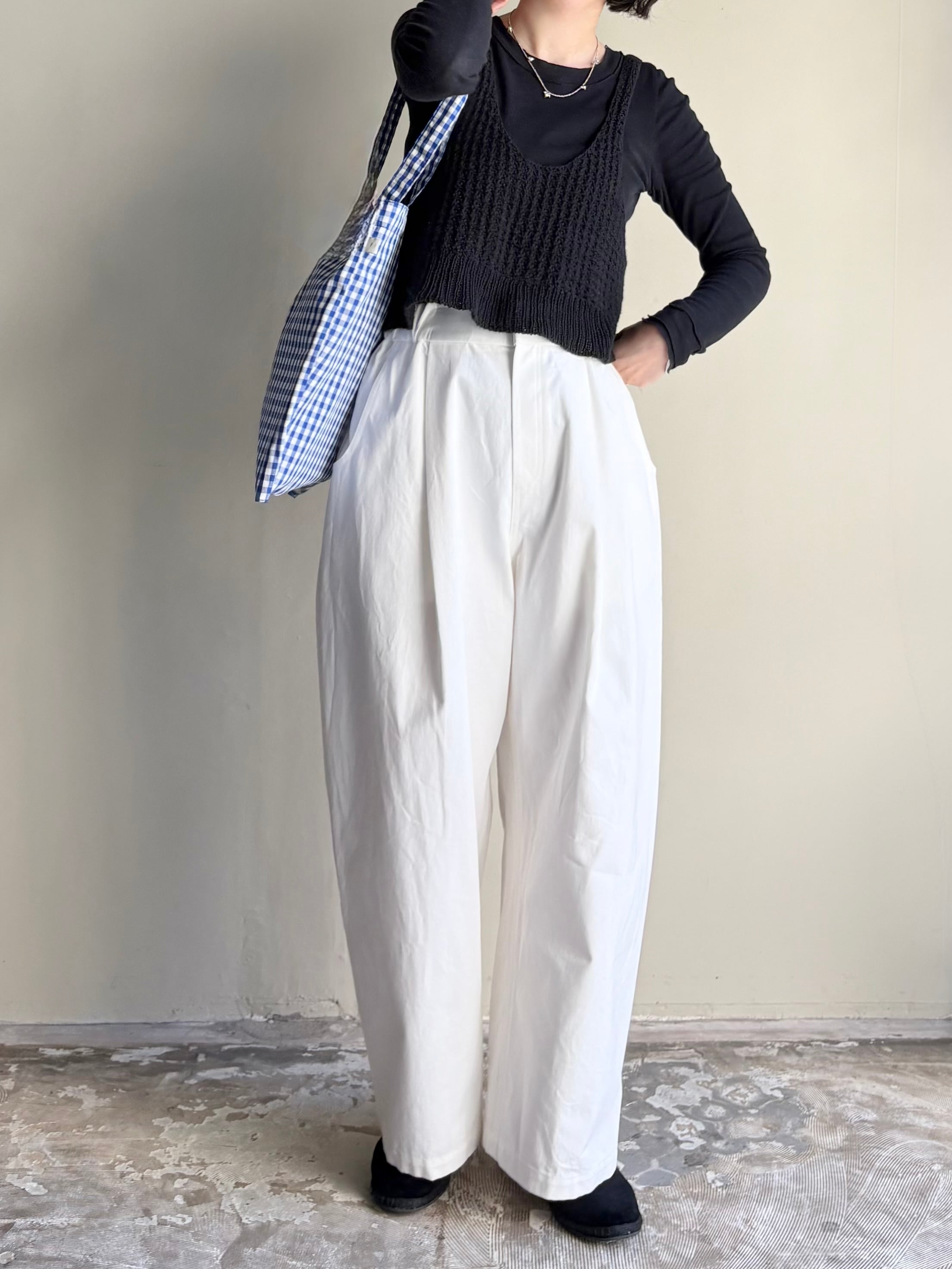 トップスを選ばず、シンプルなTシャツからブラウスまで幅広くコーディネートできる万能アイテムです。