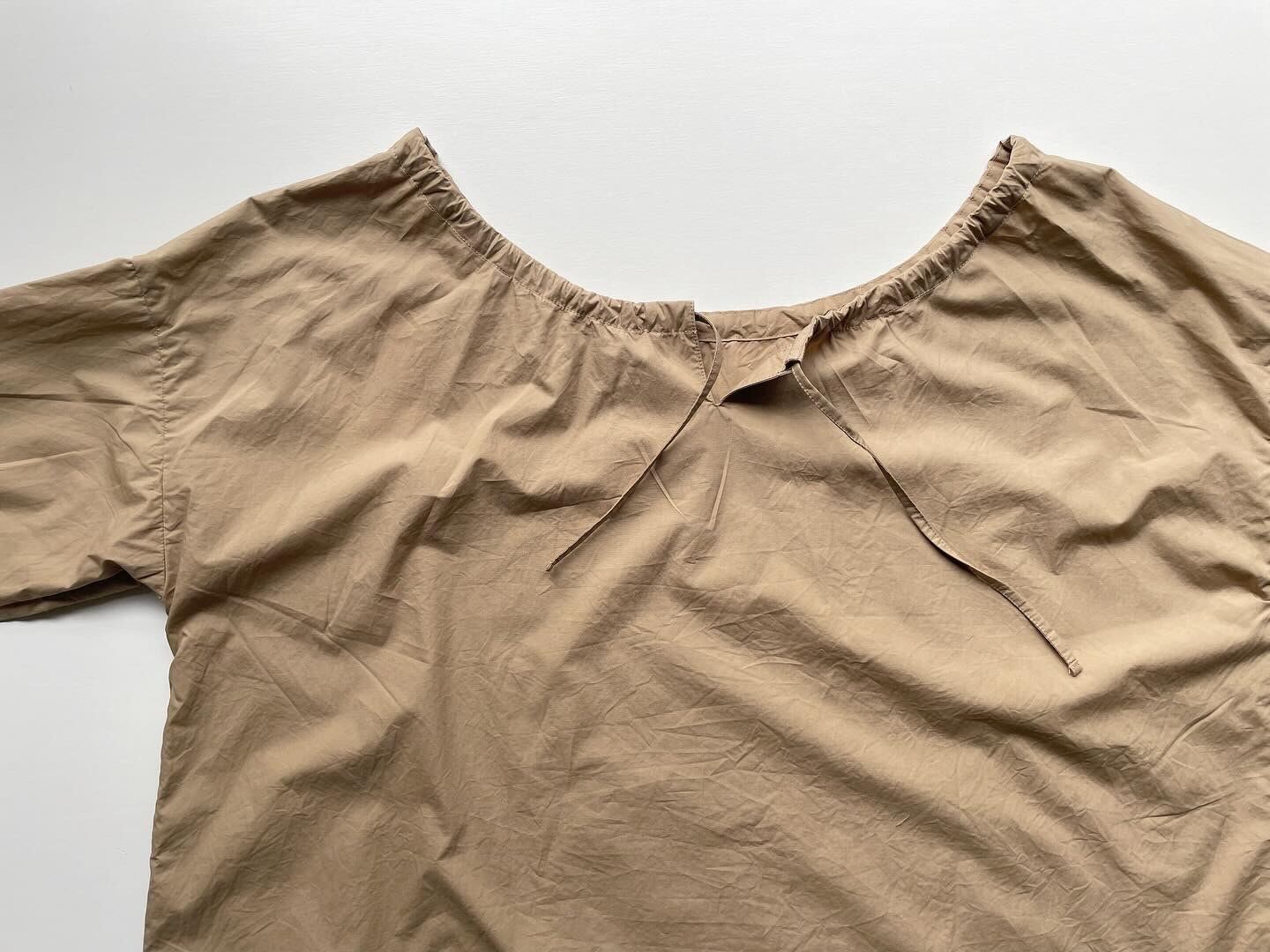 首元にグルリと入った紐を絞ることでギャザーの量や、あき具合を調整できコーディネートに合わせて楽しめるブラウスです。